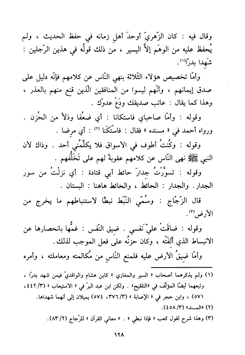 وَقَالَ فِيهِ: كَانَ الزُّهْرِيّ أوحد أهل زَمَانه فِي حفظ الحَدِيث، وَلم يحفظ عَلَيْهِ من الْوَهم إِلَّا الْيَسِير، من ذَلِك قَوْله فِي هذَيْن الرجلَيْن: شهد بَدْرًا. [15] وَأما تَخْصِيص هَؤُلَاءِ الثَّلَاثَة بنهي النَّاس عَن كَلَامهم فَإِنَّهُ دَلِيل على صدق إِيمَانهم، وَأَنَّهُمْ لَيْسُوا من الْمُنَافِقين الَّذين قنع مِنْهُم بالعذر، وَهَذَا كَمَا يُقَال: عَاتب صديقك ودع عَدوك. [15] وَقَوله: وَأما صَاحِبَايَ فاستكانا: أَي ضعفا وذلا من الْحزن. وَرَوَاهُ أَحْمد فِي " مُسْنده " فَقَالَ: فاستكنا: أَي مَرضا. [15] وَقَوله: وَكنت أَطُوف فِي الْأَسْوَاق فَلَا يكلمني أحد. وَذَاكَ لِأَن النَّبِي صلى الله عَلَيْهِ وَسلم نهى النَّاس عَن كَلَامهم عُقُوبَة لَهُم على تخلفهم. [15] وَقَوله: تسورت جِدَار حَائِط أبي قَتَادَة: أَي نزلت من سور الْجِدَار. والجدار: الْحَائِط، والحائط هَاهُنَا: الْبُسْتَان. [15] قَالَ الزّجاج: وَسمي النبط نبطا لاستنباطهم مَا يخرج من الأَرْض. [15] وَقَوله: ضَاقَتْ عَليّ نَفسِي. ضيق النَّفس: غمها بانحصارها عَن الانبساط الَّذِي ألفته، وَكَانَ حزنه على فعل الْمُوجب لذَلِك. [15] وَأما ضيق الأَرْض عَلَيْهِ فلمنع النَّاس من مكالمته ومعاملته، وَأمره