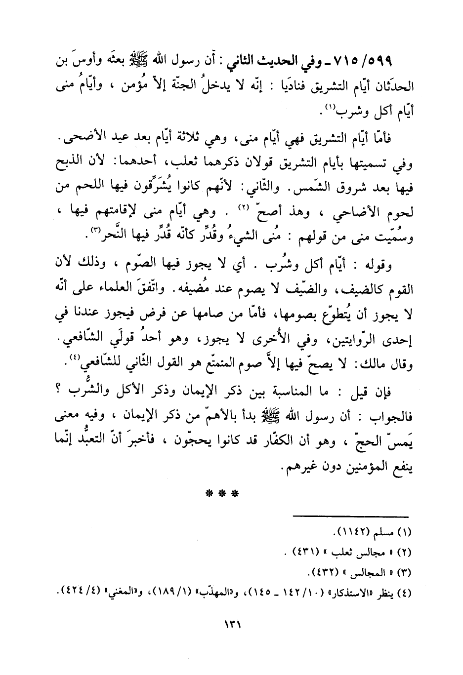 599 - / 715 - وَفِي الحَدِيث الثَّانِي: أَن رَسُول الله صلى الله عَلَيْهِ وَسلم بَعثه وَأَوْس بن الْحدثَان أَيَّام التَّشْرِيق فناديا: إِنَّه لَا يدْخل الْجنَّة إِلَّا مُؤمن، وَأَيَّام منى أَيَّام أكل وَشرب. [15] فَأَما أَيَّام التَّشْرِيق فَهِيَ أَيَّام منى، وَهِي ثَلَاثَة أَيَّام بعد عيد الْأَضْحَى. وَفِي تَسْمِيَتهَا بأيام التَّشْرِيق قَولَانِ ذكرهمَا ثَعْلَب، أَحدهمَا: لِأَن الذّبْح فِيهَا بعد شروق الشَّمْس. وَالثَّانِي: لأَنهم كَانُوا يشرقون فِيهَا اللَّحْم من لُحُوم الْأَضَاحِي، وَهَذَا أصح. وَهِي أَيَّام منى لإقامتهم فِيهَا، وَسميت منى من قَوْلهم: منى الشَّيْء وَقدر كَأَنَّهُ فِيهَا النَّحْر. [15] وَقَوله: أَيَّام أكل وَشرب. أَي لَا يجوز فِيهَا الصَّوْم، وَذَلِكَ لِأَن الْقَوْم كالضيف، والضيف لَا يَصُوم عِنْد مضيفه. وَاتفقَ الْعلمَاء على أَنه لَا يجوز أَن يتَطَوَّع بصومها، فَأَما من صامها عَن فرض فَيجوز عندنَا فِي إِحْدَى الرِّوَايَتَيْنِ، وَفِي الْأُخْرَى لَا يجوز، وَهُوَ أحد قولي الشَّافِعِي. وَقَالَ مَالك: لَا يَصح فِيهَا إِلَّا صَوْم الْمُتَمَتّع هُوَ القَوْل الثَّانِي للشَّافِعِيّ. [15] فَإِن قيل: مَا الْمُنَاسبَة بَين ذكر الْإِيمَان وَذكر الْأكل وَالشرب؟ فَالْجَوَاب: أَن رَسُول الله صلى الله عَلَيْهِ وَسلم بَدَأَ بالأهم من ذكر الْإِيمَان، وَفِيه معنى يمس الْحَج، وَهُوَ أَن الْكفَّار قد كَانُوا يحجون، فَأخْبر أَن التَّعَبُّد إِنَّمَا ينفع الْمُؤمنِينَ دون غَيرهم.