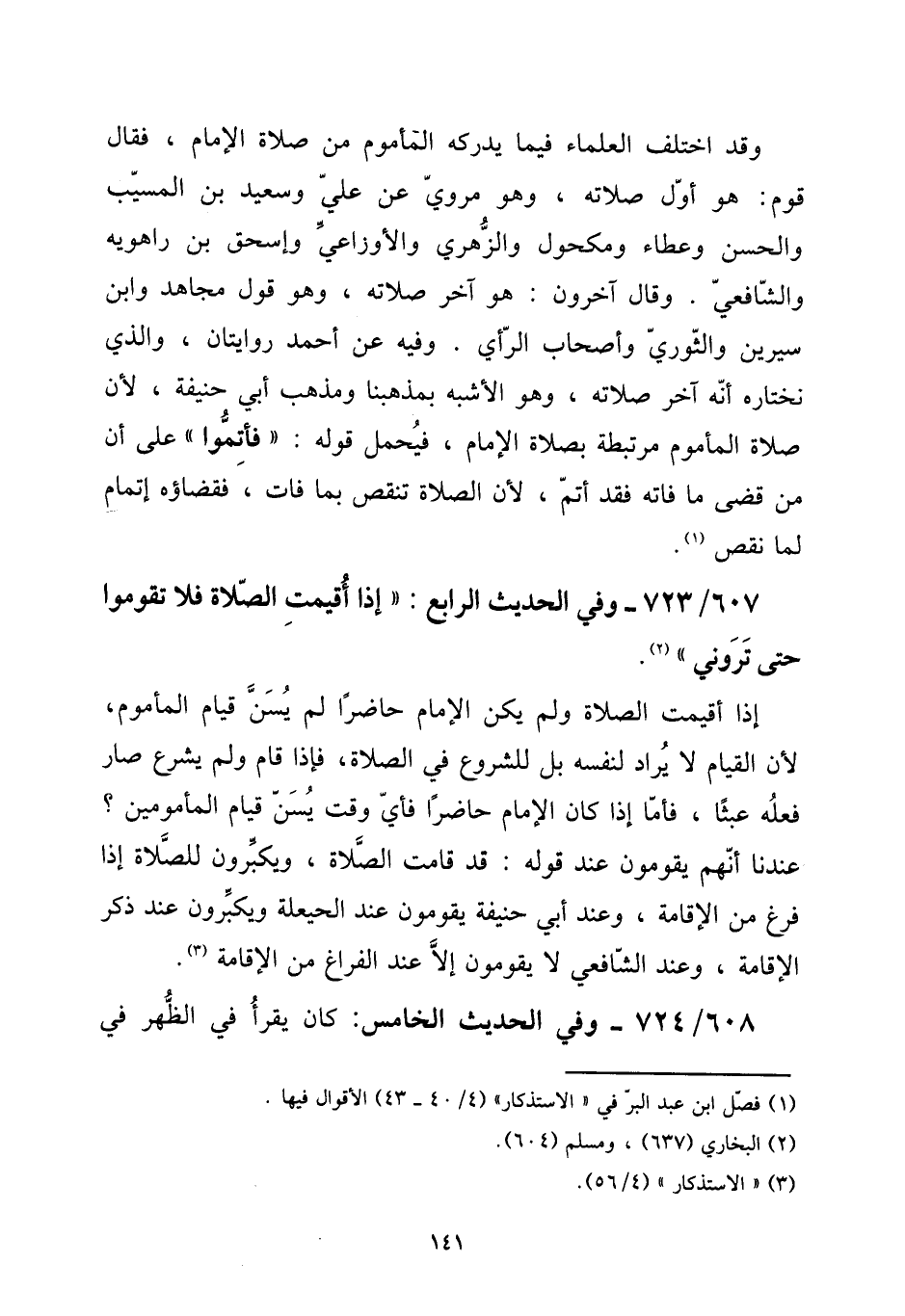 [15] وَقد اخْتلف الْعلمَاء فِيمَا يُدْرِكهُ الْمَأْمُوم من صَلَاة الإِمَام، فَقَالَ قوم: هُوَ أول صلَاته، وَهُوَ مَرْوِيّ عَن عَليّ وَسَعِيد بن الْمسيب وَالْحسن وَعَطَاء وَمَكْحُول وَالزهْرِيّ وَالْأَوْزَاعِيّ وَإِسْحَق بن رَاهَوَيْه وَالشَّافِعِيّ. وَقَالَ آخَرُونَ: هُوَ آخر صلَاته، وَهُوَ قَول مُجَاهِد وَابْن سِيرِين وَالثَّوْري وَأَصْحَاب الرَّأْي وَفِيه عَن أَحْمد رِوَايَتَانِ، وَالَّذِي نختاره أَنه آخر صلَاته، وَهُوَ الْأَشْبَه بمذهبنا وَمذهب أبي حنيفَة، لِأَن صَلَاة الْمَأْمُوم مرتبطة بِصَلَاة الإِمَام، فَيحمل قَوْله: " فَأتمُّوا " على أَن من قضى مَا فَاتَهُ فقد أتم، لِأَن الصَّلَاة تنقص بِمَا فَاتَ، فقضاؤه إتْمَام لما نقص.