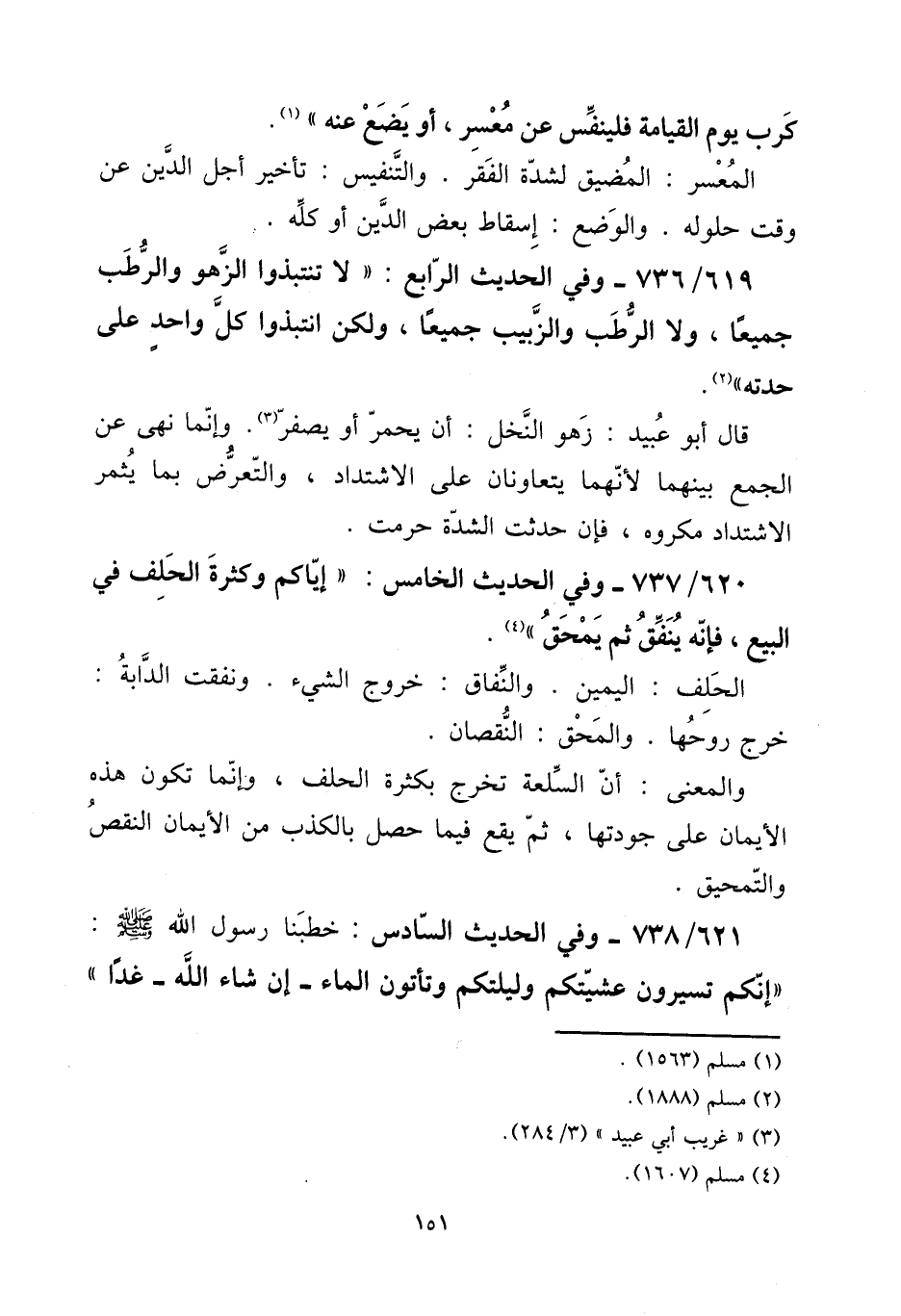 620 - / 737 وَفِي الحَدِيث الْخَامِس: " إيَّاكُمْ وَكَثْرَة الْحلف فِي البيع، فَإِنَّهُ ينْفق ثمَّ يمحق ". [15] الْحلف: الْيَمين. والنفاق: خُرُوج الشَّيْء. ونفقت الدَّابَّة: خرج روحها. والمحق: النُّقْصَان. [15] وَالْمعْنَى: أَن السّلْعَة تخرج بِكَثْرَة الْحلف، وَإِنَّمَا تكون هَذِه الْأَيْمَان على جودتها، ثمَّ يَقع فِيمَا حصل بِالْكَذِبِ من الْأَيْمَان النَّقْص والتمحيق.