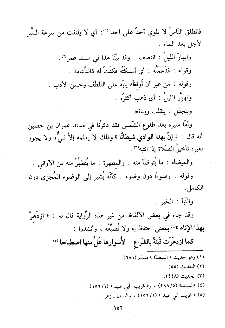 فَانْطَلق النَّاس لَا يلوي أحد على أحد: أَي لَا يلْتَفت من سرعَة السّير لأجل بعد المَاء. [15] وابهار اللَّيْل: انتصف. وَقد بَينا هَذَا فِي مُسْند عمر. [15] وَقَوله: فدعمته: أَي أمسكته فَكنت لَهُ كالدعامة. [15] وَقَوله: من غير أَن أوقظه يُنَبه على التلطف وَحسن الْأَدَب. وتهور اللَّيْل: أَي ذهب أَكْثَره. [15] وينجفل: يَنْقَلِب وَيسْقط. [15] وَأما سيره بعد طُلُوع الشَّمْس فقد ذكرنَا فِي مُسْند عمرَان بن حُصَيْن أَنه قَالَ: " إِن بِهَذَا الْوَادي شَيْطَانا " وَذَلِكَ لَا يُعلمهُ إِلَّا نَبِي، وَلَا يجوز لغيره تَأْخِير الصَّلَاة إِذا انتبه. [15] والميضأة: مَا يتَوَضَّأ مِنْهُ. والمطهرة: مَا يتَطَهَّر مِنْهُ من الْأَوَانِي. [15] وَقَوله: وضُوءًا دون وضوء. كَأَنَّهُ يُشِير إِلَى الْوضُوء المجزي دون الْكَامِل. [15] والنبأ: الْخَبَر. [15] وَقد جَاءَ فِي بعض الْأَلْفَاظ من غير هَذِه الرِّوَايَة قَالَ لَهُ: " ازدهر بِهَذَا الْإِنَاء " بِمَعْنى احتفظ بِهِ وَلَا تضيعه، وأنشدوا: