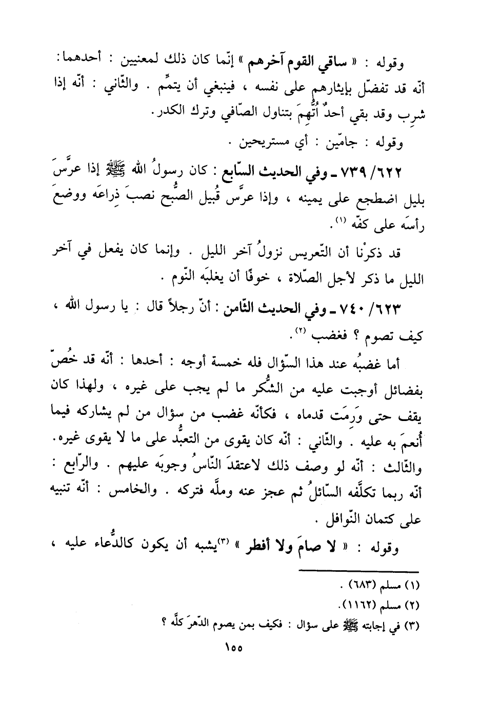 623 - / 740 وَفِي الحَدِيث الثَّامِن: أَن رجلا قَالَ: يَا رَسُول الله، كَيفَ تَصُوم؟ فَغَضب. [15] أما غَضَبه عِنْد هَذَا السُّؤَال فَلهُ خَمْسَة أوجه: أَحدهَا: أَنه قد خص بفضائل أوجبت عَلَيْهِ من الشُّكْر مَا لم يجب على غَيره، وَلِهَذَا كَانَ يقف حَتَّى ورمت قدماه، فَكَأَنَّهُ غضب من سُؤال من لم يُشَارِكهُ فِيمَا أنعم بِهِ عَلَيْهِ. وَالثَّانِي: أَنه كَانَ يقوى من التَّعَبُّد على مَالا لَا يقوى غَيره. وَالثَّالِث: أَنه لَو وصف ذَلِك لاعتقد النَّاس وُجُوبه عَلَيْهِم. وَالرَّابِع: أَنه رُبمَا تكلفه السَّائِل ثمَّ عجز عَنهُ ومله فَتَركه. وَالْخَامِس: أَنه تَنْبِيه على كتمان النَّوَافِل. [15] وَقَوله: " لَا صَامَ وَلَا أفطر " يشبه أَن يكون كالدعاء عَلَيْهِ،