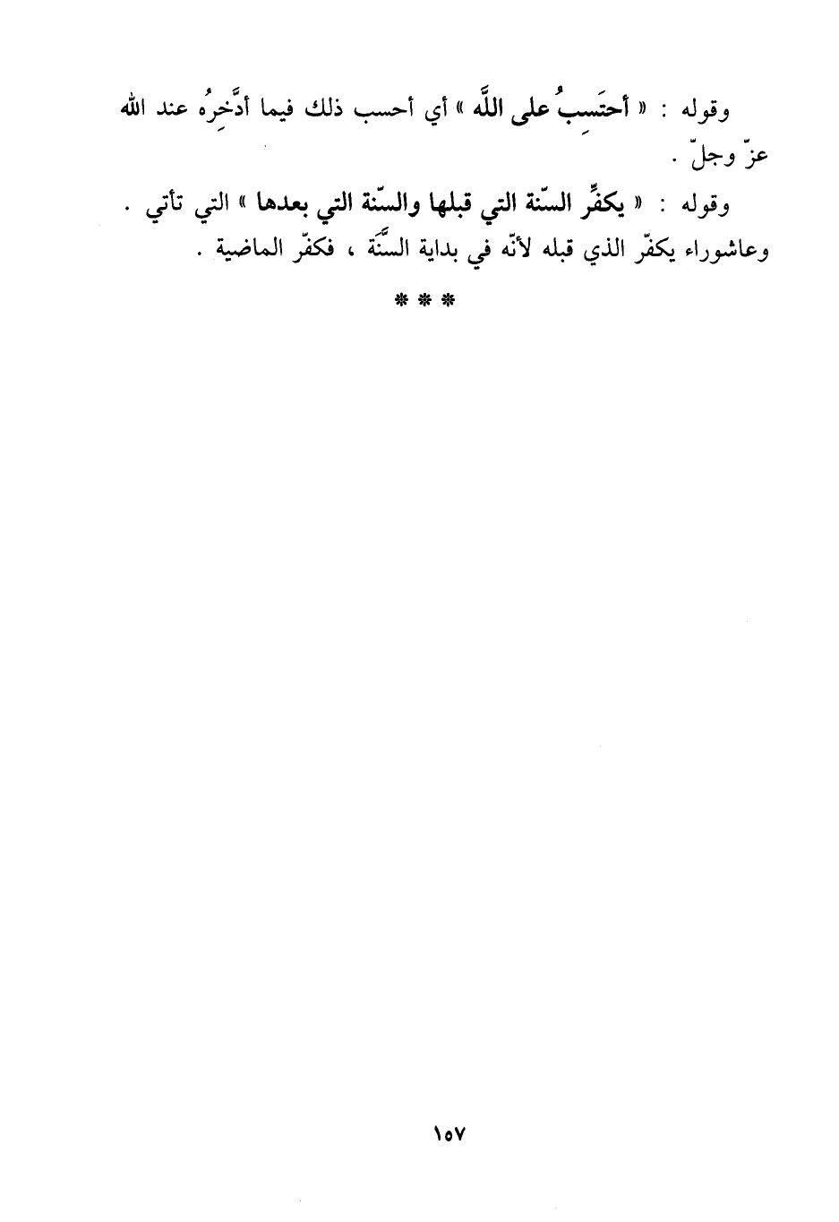 [15] وَقَوله: " أحتسب على الله " أَي أَحسب ذَلِك فِيمَا أدخره عِنْد الله عز وَجل. [15] وَقَوله: " يكفر السّنة الَّتِي قبلهَا وَالسّنة الَّتِي بعْدهَا " الَّتِي تَأتي. وعاشوراء يكفر الَّذِي قبله لِأَنَّهُ فِي بداية السّنة، فَكفر الْمَاضِيَة،