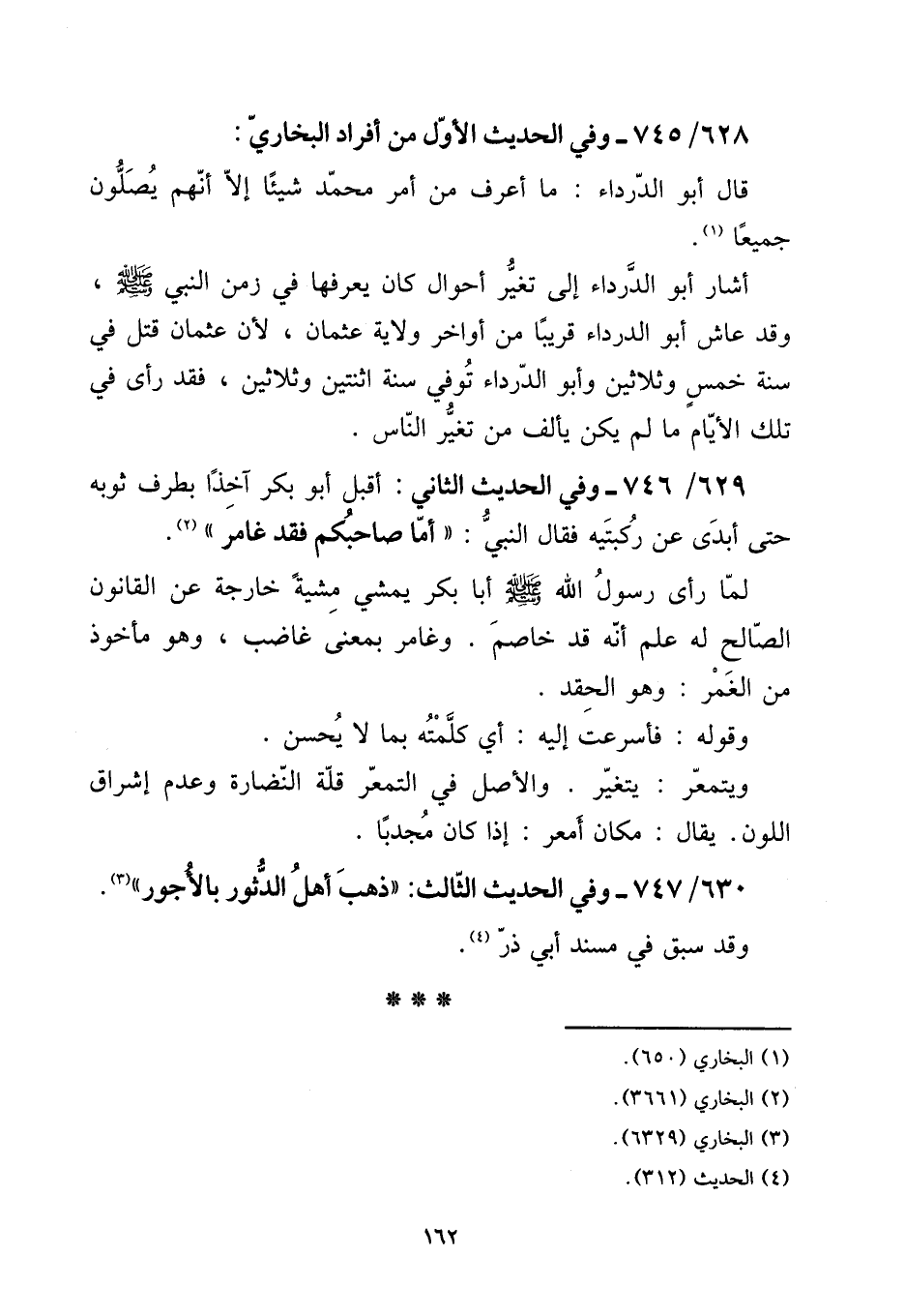628 - / 745 - وَفِي الحَدِيث الأول من أَفْرَاد البُخَارِيّ: [15] قَالَ أَبُو الدَّرْدَاء: مَا أعرف من أَمر مُحَمَّد شَيْئا إِلَّا أَنهم يصلونَ جَمِيعًا. [15] أَشَارَ أَبُو الدَّرْدَاء إِلَى تغير أَحْوَال كَانَ يعرفهَا فِي زمن النَّبِي صلى الله عَلَيْهِ وَسلم، وَقد عَاشَ أَبُو الدَّرْدَاء قَرِيبا من أَوَاخِر ولَايَة عُثْمَان، لِأَن عُثْمَان قتل فِي سنة خمس وَثَلَاثِينَ وَأَبُو الدَّرْدَاء توفّي سنة اثْنَتَيْنِ وَثَلَاثِينَ، فقد رأى فِي تِلْكَ الْأَيَّام مَا لم يكن يألف من تغير النَّاس.