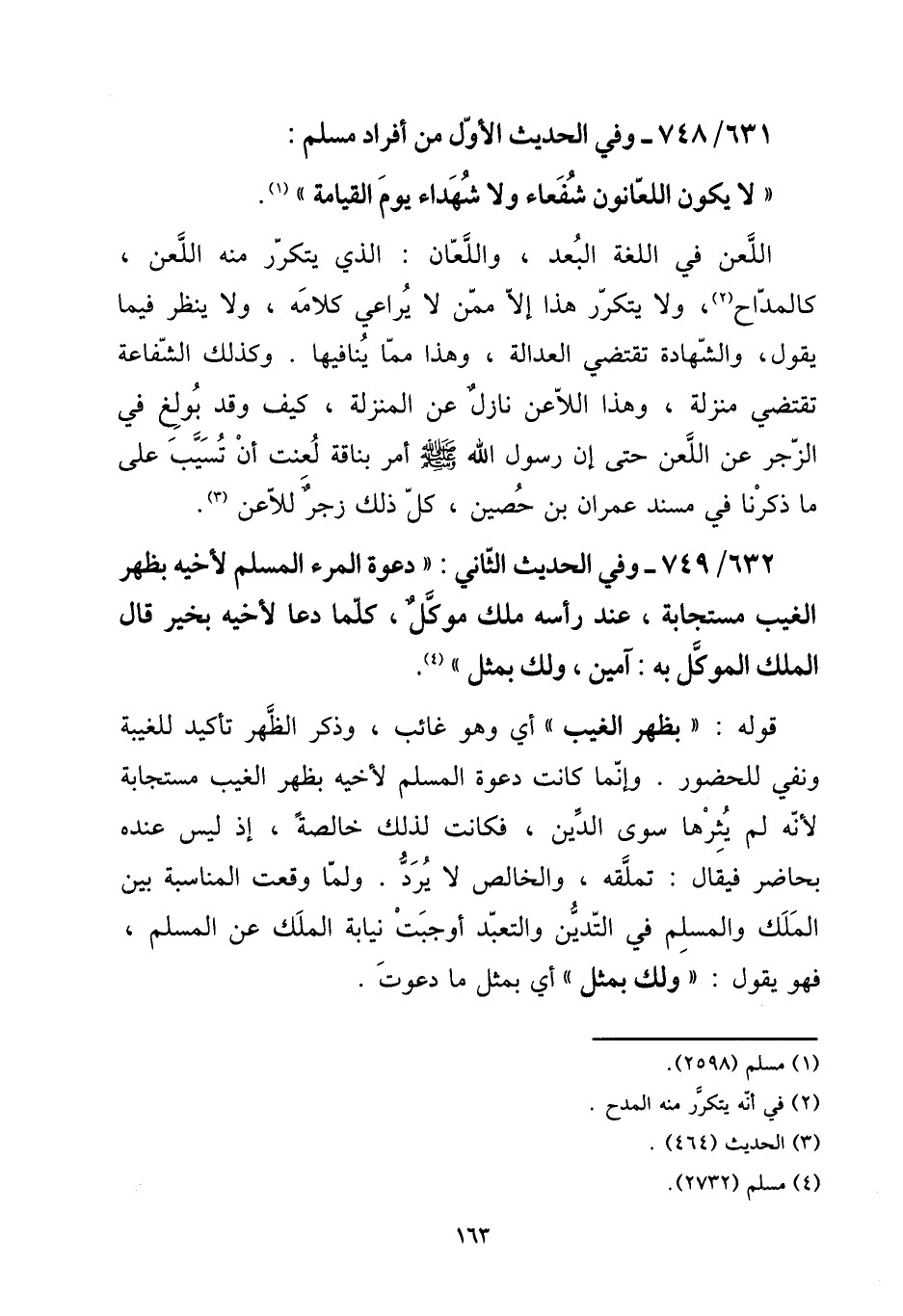 631 - / 748 - وَفِي الحَدِيث الأول من أَفْرَاد مُسلم. " لَا يكون اللعانون شُفَعَاء وَلَا شُهَدَاء يَوْم الْقِيَامَة " [15] اللَّعْن فِي اللُّغَة الْبعد، وَاللّعان: الَّذِي يتَكَرَّر مِنْهُ اللَّعْن، كالمداح، وَلَا يتَكَرَّر هَذَا إِلَّا مِمَّن لَا يُرَاعِي كَلَامه، وَلَا ينظر فِيمَا يَقُول، وَالشَّهَادَة تَقْتَضِي الْعَدَالَة، وَهَذَا مِمَّا ينافيها. وَكَذَلِكَ الشَّفَاعَة تَقْتَضِي منزلَة، وَهَذَا اللاعن نَازل عَن الْمنزلَة، كَيفَ وَقد بولغ فِي الزّجر عَن اللَّعْن حَتَّى أَن رَسُول الله صلى الله عَلَيْهِ وَسلم أَمر بِنَاقَة لعنت أَن تسيب على مَا ذكرنَا فِي مُسْند عمرَان بن حُصَيْن، كل ذَلِك زجر للاعن.