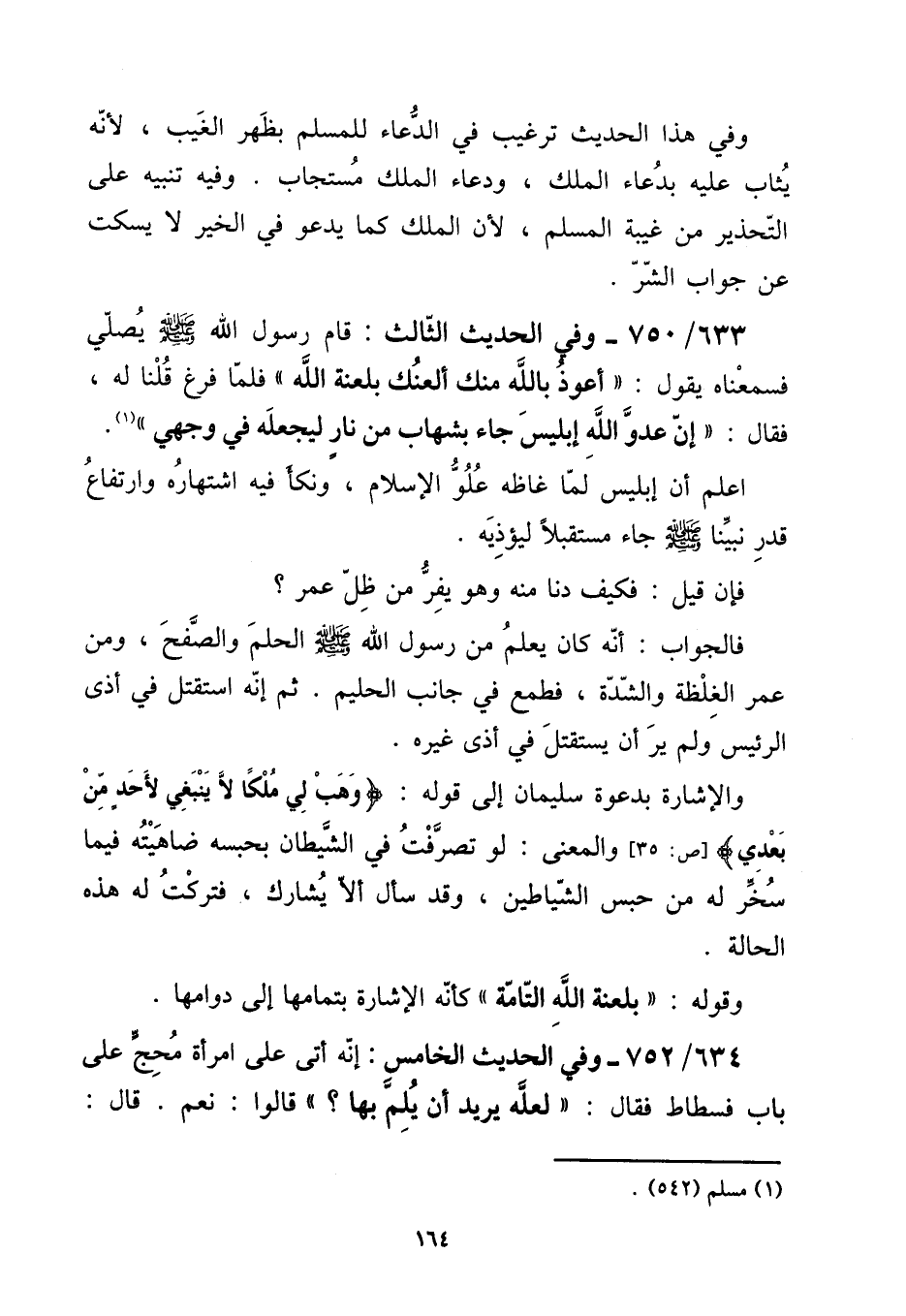633 - / 750 - وَفِي الحَدِيث الثَّالِث: قَامَ رَسُول الله صلى الله عَلَيْهِ وَسلم يُصَلِّي فسمعناه يَقُول: " أعوذ بِاللَّه مِنْك ألعنك بلعنة الله " فَلَمَّا فرغ قُلْنَا لَهُ، فَقَالَ: " إِن عَدو الله إِبْلِيس جَاءَ بشهاب من نَار ليجعله فِي وَجْهي " [15] اعْلَم أَن إِبْلِيس لما غاظه علو الْإِسْلَام، ونكا فِيهِ اشتهاره وارتفاع قدر نَبينَا صلى الله عَلَيْهِ وَسلم جَاءَ مُسْتَقْبلا ليؤذيه. [15] فَإِن قيل: فَكيف دنا مِنْهُ وَهُوَ يفر من ظلّ عمر؟ [15] فَالْجَوَاب: أَنه كَانَ يعلم من رَسُول الله صلى الله عَلَيْهِ وَسلم الْحلم والصفح، وَمن عمر الغلظة والشدة، فطمع فِي جَانب الْحَلِيم. ثمَّ إِنَّه استقتل فِي أَذَى الرئيس وَلم ير أَن يستقتل فِي أَذَى غَيره. [15] وَالْإِشَارَة بدعوة سُلَيْمَان إِلَى قَوْله: {وهب لي ملكا لَا يَنْبَغِي لأحد من بعدِي} [ص: 35] وَالْمعْنَى: لَو تصرفت فِي الشَّيْطَان بحبسه ضاهيته فِيمَا سخر لَهُ من حبس الشَّيَاطِين، وَقد سَأَلَ أَلا يُشَارك، فَتركت لَهُ هَذِه الْحَالة. [15] وَقَوله: " بلعنة الله التَّامَّة " كَأَنَّهُ الْإِشَارَة بِتَمَامِهَا إِلَى دوامها.
