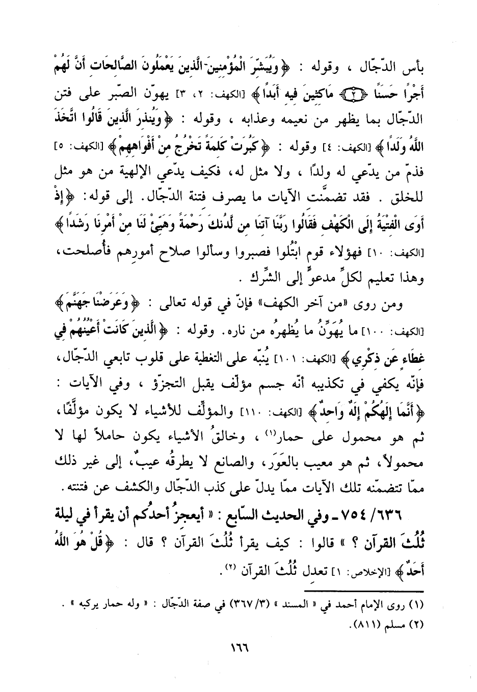 بَأْس الدَّجَّال، وَقَوله: {ويبشر الْمُؤمنِينَ الَّذين يعْملُونَ الصَّالِحَات أَن لَهُم أجرا حسنا ماكثين فِيهِ أبدا} [الْكَهْف: 2، 3] يهون الصَّبْر على فتن الدَّجَّال بِمَا يظْهر من نعيمه وعذابه، وَقَوله: {وينذر الَّذين قَالُوا اتخذ الله ولدا} [الْكَهْف: 4] وَقَوله: {كَبرت كلمة تخرج من أَفْوَاههم} [الْكَهْف: 5] فذم من يَدعِي لَهُ ولدا، وَلَا مثل لَهُ، فَكيف يَدعِي الإلهية من هُوَ مثل لِلْخلقِ. فقد تَضَمَّنت الْآيَات مَا يصرف فتْنَة الدَّجَّال. إِلَى قَوْله: {إِذْ أَوَى الْفتية إِلَى الْكَهْف فَقَالُوا رَبنَا آتنا من لَدُنْك رَحْمَة وهيئ لنا من أمرنَا رشدا} [الْكَهْف: 10] فَهَؤُلَاءِ قوم ابتلوا فصبروا وسألوا صَلَاح أُمُورهم فأصلحت، وَهَذَا تَعْلِيم لكل مدعُو إِلَى الشّرك. [15] وَمن روى " من آخر الْكَهْف " فَإِن فِي قَوْله تَعَالَى: {وعرضنا جَهَنَّم} [الْكَهْف: 100] مَا يهون مَا يظهره من ناره. وَقَوله: {الَّذين كَانَت أَعينهم فِي غطاء عَن ذكري} [الْكَهْف: 101] يُنَبه على التغطية على قُلُوب تَابِعِيّ الدَّجَّال، فَإِنَّهُ يَكْفِي فِي تَكْذِيبه أَنه جسم مؤلف يقبل التجزؤ، وَفِي الْآيَات: {أَنما إِلَهكُم إِلَه وَاحِد} [الْكَهْف: 110] والمؤلف للأشياء لَا يكون مؤلفا، ثمَّ هُوَ مَحْمُول على حمَار، وخالق الْأَشْيَاء يكون حَامِلا لَهَا لَا مَحْمُولا، ثمَّ هُوَ معيب بالعور، والصانع لَا يطرقه عيب، إِلَى غير ذَلِك مِمَّا تتضمنه تِلْكَ الْآيَات مِمَّا يدل على كذب الدَّجَّال والكشف عَن فتنته.