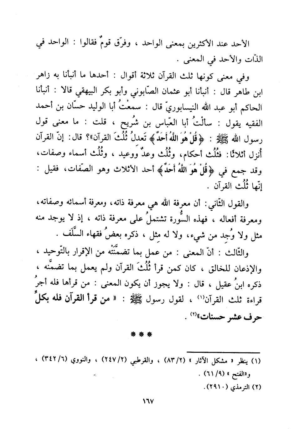 [15] الْأَحَد عِنْد الْأَكْثَرين بِمَعْنى الْوَاحِد، وَفرق قوم فَقَالُوا: الْوَاحِد فِي الذَّات والأحد فِي الْمَعْنى. [15] وَفِي معنى كَونهَا ثلث الْقُرْآن ثَلَاثَة أَقْوَال: أَحدهَا مَا أَنبأَنَا بِهِ زَاهِر ابْن طَاهِر قَالَ: أَنبأَنَا أَبُو عُثْمَان الصَّابُونِي وَأَبُو بكر الْبَيْهَقِيّ قَالَا: أَنبأَنَا الْحَاكِم أَبُو عبد الله النَّيْسَابُورِي قَالَ: سَمِعت أَبَا الْوَلِيد حسان بن أَحْمد الْفَقِيه يَقُول: سَأَلت أَبَا الْعَبَّاس بن شُرَيْح، قلت: مَا معنى قَول رَسُول الله صلى الله عَلَيْهِ وَسلم: {قل هُوَ الله أحد} تعدل ثلث الْقُرْآن "؟ قَالَ: إِن الْقُرْآن أنزل أَثلَاثًا: فثلث أَحْكَام، وَثلث وعد ووعيد، وَثلث أَسمَاء وصفات، وَقد جمع فِي {قل هُوَ الله أحد} أحد الأثلاث وَهُوَ الصِّفَات، فَقيل: إِنَّهَا ثلث الْقُرْآن. [15] وَالْقَوْل الثَّانِي: أَن معرفَة الله هِيَ معرفَة ذَاته، وَمَعْرِفَة أَسْمَائِهِ وَصِفَاته، وَمَعْرِفَة أَفعاله، فَهَذِهِ السُّورَة تشْتَمل على معرفَة ذَاته، إِذْ لَا يُوجد مِنْهُ مثل وَلَا وجد من شَيْء، وَلَا لَهُ مثل، ذكره بعض فُقَهَاء السّلف. [15] وَالثَّالِث: أَن الْمَعْنى: من عمل بِمَا تضمنته من الْإِقْرَار بِالتَّوْحِيدِ، والإذعان للخالق، كَانَ كمن قَرَأَ ثلث الْقُرْآن وَلم يعْمل بِمَا تضمنه، ذكره ابْن عقيل، قَالَ: وَلَا يجوز أَن يكون الْمَعْنى: من قَرَأَهَا فَلهُ أجر قِرَاءَة ثلث الْقُرْآن، لقَوْل رَسُول صلى الله عَلَيْهِ وَسلم: " من قَرَأَ الْقُرْآن فَلهُ بِكُل حرف عشر حَسَنَات ".