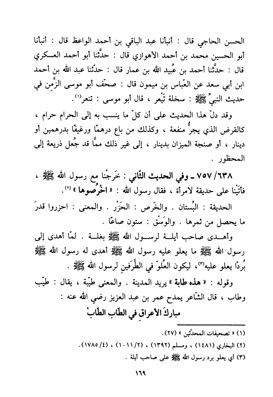 الْحسن الحاجي قَالَ: أَنبأَنَا عبد الْبَاقِي بن أَحْمد الْوَاعِظ قَالَ: أَنبأَنَا أَبُو الْحُسَيْن مُحَمَّد بن أَحْمد الْأَهْوَازِي قَالَ: حَدثنَا أَبُو أَحْمد العسكري قَالَ: حَدثنَا أَحْمد بن عبيد الله بن عمار قَالَ: حَدثنَا عبد الله بن أَحْمد ابْن أبي سعد عَن الْعَبَّاس بن مَيْمُون قَالَ: صحف أَبُو مُوسَى الزَّمن فِي حَدِيث النَّبِي صلى الله عَلَيْهِ وَسلم: سخلة تَيْعر، قَالَ أَبُو مُوسَى: تنعر. [15] وَقد دلّ هَذَا الحَدِيث على أَن كل مَا ينْسب بِهِ إِلَى الْحَرَام حرَام، كالقرض الَّذِي يجر مَنْفَعَة، وَكَذَلِكَ من بَاعَ درهما ورغيفا بِدِرْهَمَيْنِ أَو دِينَار، أَو صنجة الْمِيزَان بِدِينَار، إِلَى غير ذَلِك مِمَّا قد جعل ذَرِيعَة إِلَى الْمَحْظُور.