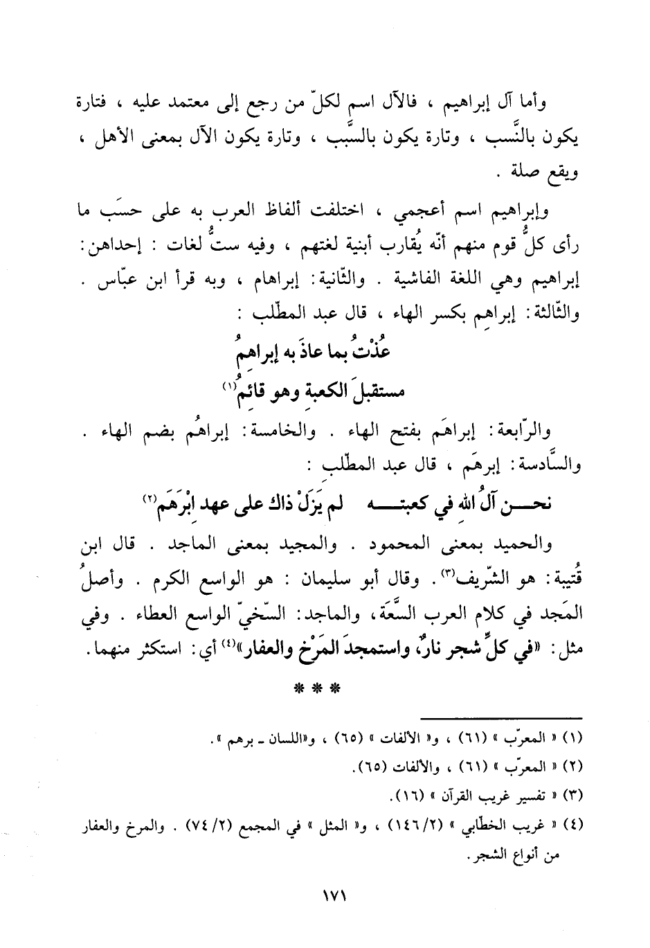 [15] وَأما آل إِبْرَاهِيم، فالآل اسْم لكل من رَجَعَ إِلَى مُعْتَمد عَلَيْهِ، فَتَارَة يكون بِالنّسَبِ، وَتارَة يكون بِالسَّبَبِ، وَتارَة يكون الْآل بِمَعْنى الْأَهْل، وَيَقَع صلَة. [15] وَإِبْرَاهِيم اسْم أعجمي، اخْتلفت أَلْفَاظ الْعَرَب بِهِ على حسب مَا رأى كل قوم مِنْهُم أَنه يُقَارب أبنية لغتهم، وَفِيه سِتّ لُغَات: إِحْدَاهُنَّ: إِبْرَاهِيم وَهِي اللُّغَة الفاشية. وَالثَّانيَِة: إبراهام، وَبِه قَرَأَ ابْن عَبَّاس. وَالثَّالِثَة: إبراهم بِكَسْر الْهَاء، قَالَ عبد الْمطلب: