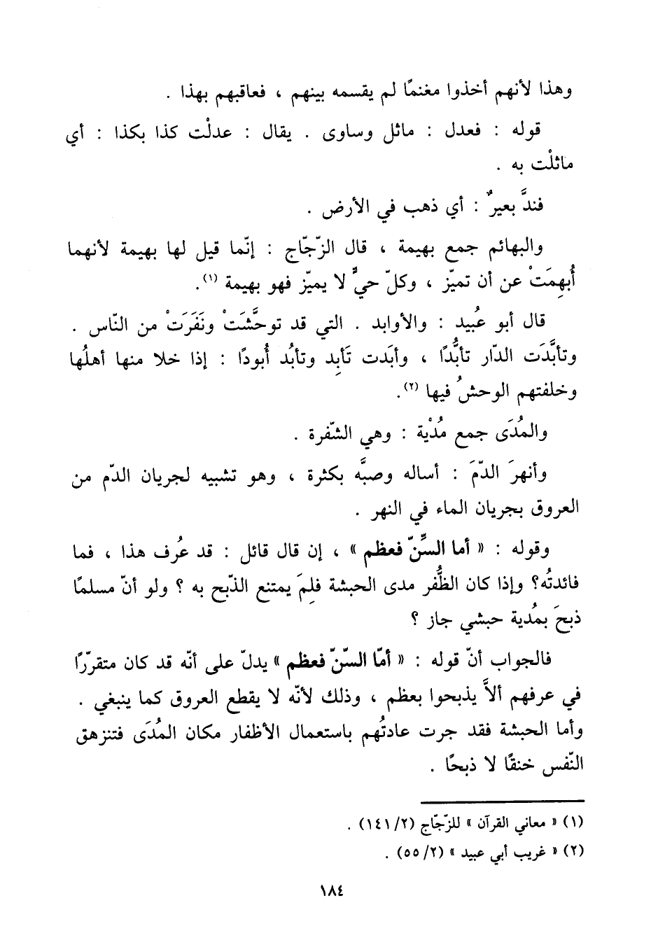 وَهَذَا لأَنهم أخذُوا مغنما لم يقسمهُ بَينهم، فعاقبهم بِهَذَا. [15] قَوْله: فَعدل: ماثل وساوى. يُقَال: عدلت كَذَا بِكَذَا: أَي ماثلت بِهِ. [15] فند بعير: أَي ذهب فِي الأَرْض. [15] والبهائم جمع بَهِيمَة، قَالَ الزّجاج: إِنَّمَا قيل لَهَا بَهِيمَة لِأَنَّهُمَا أبهمت عَن أَن تميز، وكل حَيّ لَا يُمَيّز فَهُوَ بَهِيمَة. [15] قَالَ أَبُو عبيد: والأوابد. الَّتِي قد توحشت ونفرت من النَّاس. وتأبدت الدَّار تأبدا، وأبدت تأبد وتأبد أبودا: إِذا خلا مِنْهَا أَهلهَا وخلفتهم الْوَحْش فِيهَا. [15] والمدى جمع مدية: وَهِي الشَّفْرَة. [15] وأنهر الدَّم: أساله وصبه بِكَثْرَة، وَهُوَ تَشْبِيه لجَرَيَان الدَّم من الْعُرُوق بجريان المَاء فِي النَّهر. [15] وَقَوله: " أما السن فَعظم "، إِن قَالَ قَائِل: قد عرف هَذَا، فَمَا فَائِدَته؟ وَإِذا كَانَ الظفر مدى الْحَبَشَة فَلم يمْتَنع الذّبْح بِهِ؟ وَلَو أَن مُسلما ذبح بمدية حبشِي جَازَ؟ [15] فَالْجَوَاب أَن قَوْله: " أما السن فَعظم " يدل على أَنه قد كَانَ متقررا فِي عرفهم أَلا يذبحوا بِعظم، وَذَلِكَ لِأَنَّهُ لَا يقطع الْعُرُوق كَمَا يَنْبَغِي. وَأما الْحَبَشَة فقد جرت عَادَتهم بِاسْتِعْمَال الْأَظْفَار مَكَان المدى فتنزهق النَّفس خنقا لَا ذبحا.