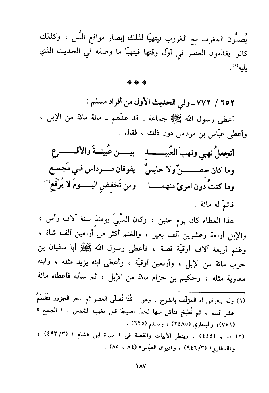 652 - / 772 - وَفِي الحَدِيث الأول من أَفْرَاد مُسلم: أعْطى رَسُول الله صلى الله عَلَيْهِ وَسلم جمَاعَة - قد عدهم - مائَة مائَة من الْإِبِل، وَأعْطى عَبَّاس بن مرداس دون ذَلِك، فَقَالَ: