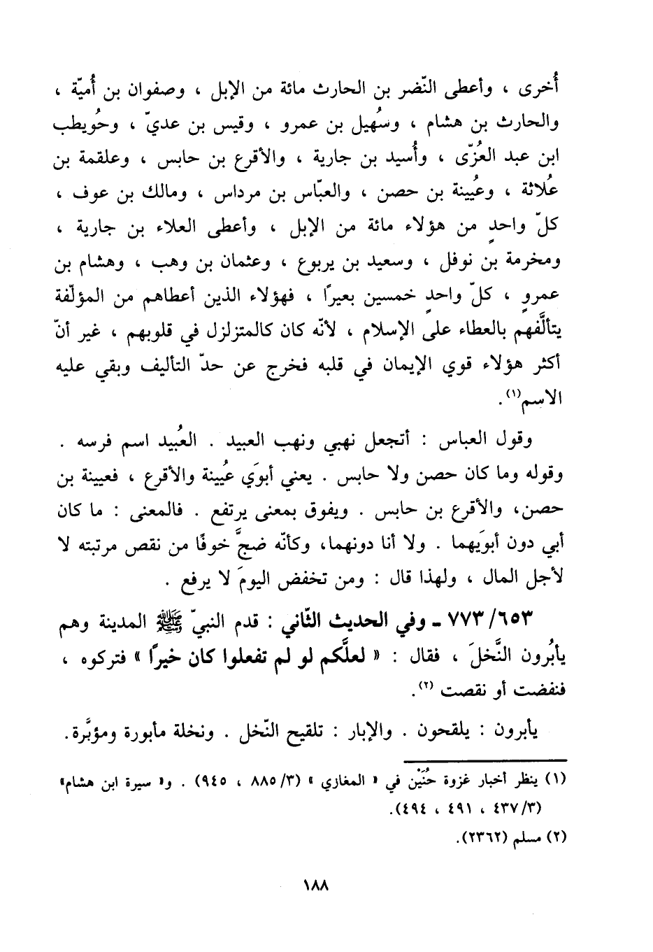 أُخْرَى، وَأعْطى النَّضر بن الْحَارِث مائَة من الْإِبِل، وَصَفوَان بن أُميَّة، والْحَارث بن هِشَام، وَسُهيْل بن عَمْرو، وَقيس بن عدي، وَحُوَيْطِب ابْن عبد الْعُزَّى، وَأسيد بن جَارِيَة، والأقرع بن حَابِس، وعلقمة بن علاثة، وعيينة بن حصن، وَالْعَبَّاس بن مرداس، وَمَالك بن عَوْف، كل وَاحِد من هَؤُلَاءِ مائَة من الْإِبِل، وَأعْطى الْعَلَاء بن جَارِيَة، ومخرمة بن نَوْفَل، وَسَعِيد بن يَرْبُوع، وَعُثْمَان بن وهب، وَهِشَام بن عَمْرو، كل وَاحِد خمسين بَعِيرًا، فَهَؤُلَاءِ الَّذين أَعْطَاهُم من الْمُؤَلّفَة يتألفهم بالعطاء على الْإِسْلَام، لِأَنَّهُ كَانَ كالمتزلزل فِي قُلُوبهم، غير أَن أَكثر هَؤُلَاءِ قوي الْإِيمَان فِي قلبه فَخرج عَن حد التَّأْلِيف وَبَقِي عَلَيْهِ الِاسْم. [15] وَقَول الْعَبَّاس: أَتجْعَلُ نَهْبي وَنهب العبيد. العبيد اسْم فرسه. وَقَوله وَمَا كَانَ حصن وَلَا حَابِس. يَعْنِي أَبَوي عُيَيْنَة والأقرع، فعيينة بن حصن، والأقرع بن حَابِس. ويفوق بِمَعْنى يرْتَفع. فَالْمَعْنى: مَا كَانَ أبي دون أبويهما. وَلَا أَنا دونهمَا، وَكَأَنَّهُ ضج خوفًا من نقص مرتبته لَا لأجل المَال، وَلِهَذَا قَالَ: وَمن تخْفض الْيَوْم لَا يرفع.