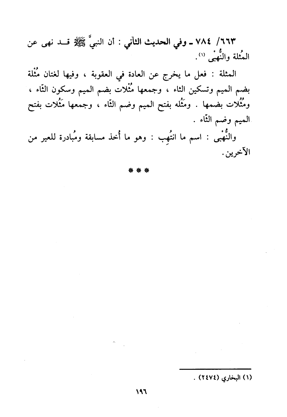 663 - / 784 وَفِي الحَدِيث الثَّانِي: أَن النَّبِي صلى الله عَلَيْهِ وَسلم قد نهى عَن الْمثلَة والنهبى. [15] الْمثلَة: فعل مَا يخرج عَن الْعَادة فِي الْعقُوبَة، وفيهَا لُغَتَانِ مثلَة بِضَم الْمِيم وتسكين الثَّاء، وَجَمعهَا مثلات بِضَم الْمِيم وَسُكُون الثَّاء، ومثلات بضَمهَا. ومثلة بِفَتْح الْمِيم وَضم الثَّاء، وَجَمعهَا مثلات بِفَتْح الْمِيم وَضم الثَّاء. [15] وَالنَّهْي: اسْم مَا انتهب: وَهُوَ مَا أَخذ مسابقة ومبادرة للعير من الآخرين.