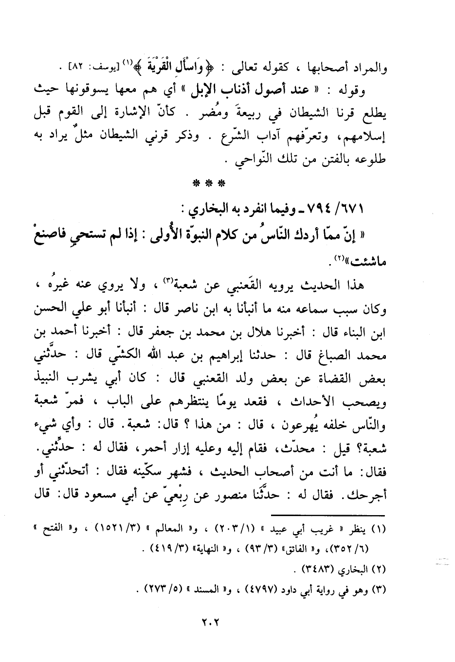 671 - / 794 - وَفِيمَا انْفَرد بِهِ البُخَارِيّ: " إِن مِمَّا أردك النَّاس من كَلَام النُّبُوَّة الأولى: إِذا لم تَسْتَحي فَاصْنَعْ مَا شِئْت ". [15] هَذَا الحَدِيث يرويهِ القعْنبِي عَن شُعْبَة، وَلَا يروي عَنهُ غَيره، وَكَانَ سَبَب سَمَاعه مِنْهُ مَا أَنبأَنَا بِهِ ابْن نَاصِر قَالَ: