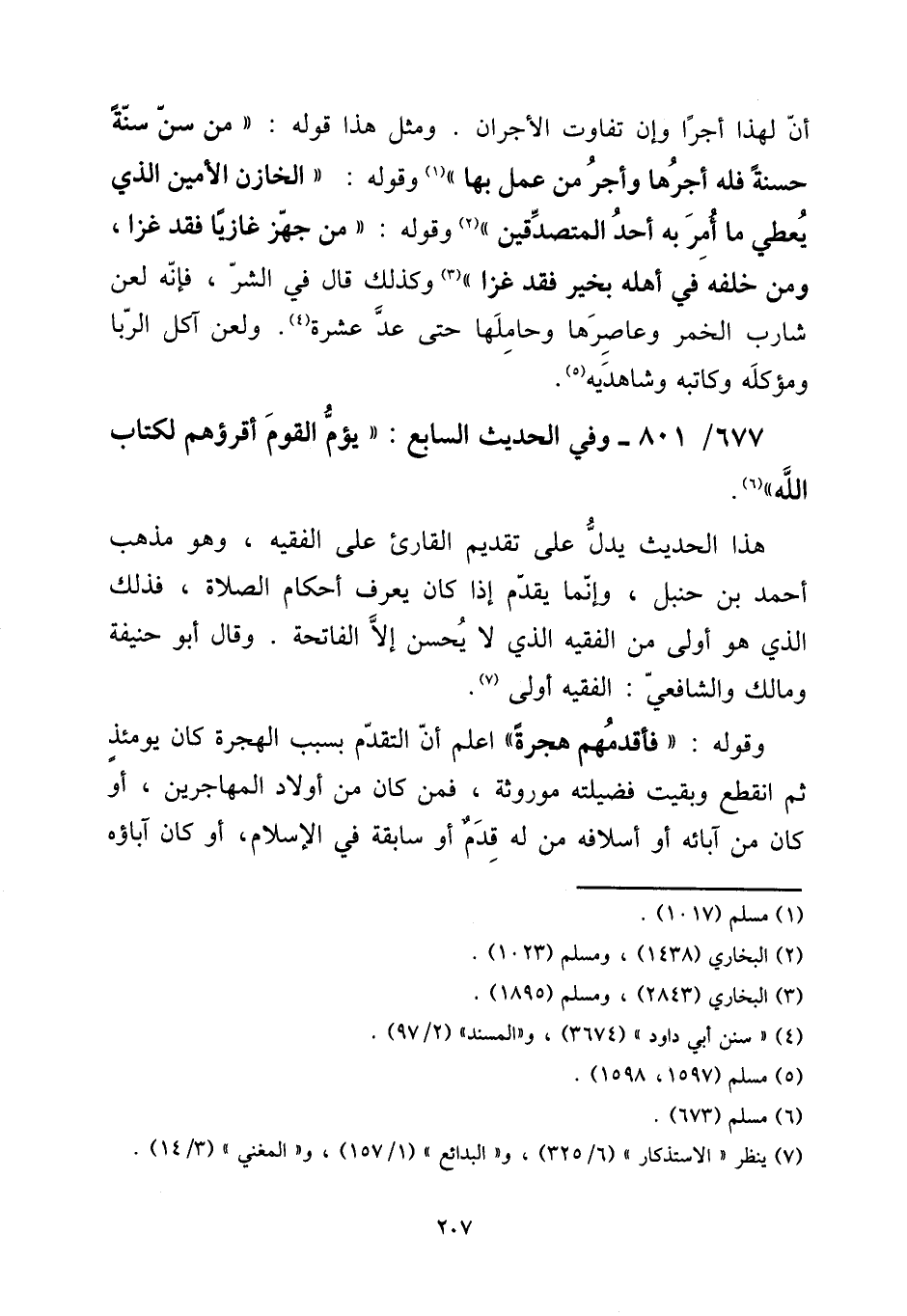 677 - / 801 وَفِي الحَدِيث السَّابِع: " يؤم الْقَوْم أقرؤهم لكتاب الله ". [15] هَذَا الحَدِيث يدل على تَقْدِيم الْقَارئ على الْفَقِيه، وَهُوَ مَذْهَب أَحْمد بن حَنْبَل، وَإِنَّمَا يقدم إِذا كَانَ يعرف أَحْكَام الصَّلَاة، فَذَلِك الَّذِي هُوَ أولى من الْفَقِيه الَّذِي لَا يحسن إِلَّا الْفَاتِحَة. وَقَالَ أَبُو حنيفَة وَمَالك وَالشَّافِعِيّ: الْفَقِيه أولى. [15] وَقَوله: " فأقدمهم هِجْرَة " اعْلَم أَن التَّقَدُّم بِسَبَب الْهِجْرَة كَانَ يَوْمئِذٍ ثمَّ انْقَطع وَبقيت فضيلته موروثة، فَمن كَانَ من أَوْلَاد الْمُهَاجِرين، أَو كَانَ من آبَائِهِ أَو أسلافه من لَهُ قدم أَو سَابِقَة فِي الْإِسْلَام، أَو كَانَ آباؤه