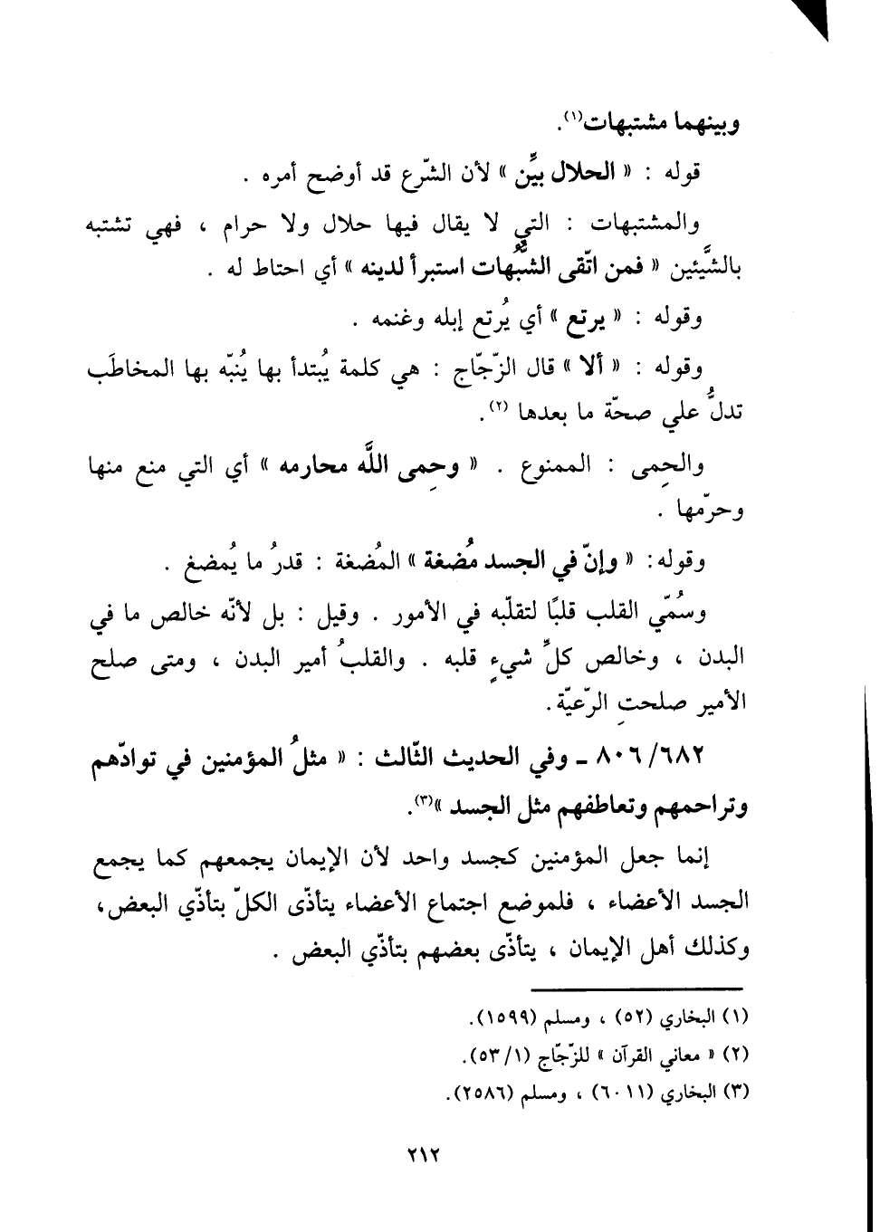 وَبَينهمَا مُشْتَبهَات. [15] قَوْله: " الْحَلَال بَين " لِأَن الشَّرْع قد أوضح أمره. [15] والمشتبهات: الَّتِي لَا يُقَال فِيهَا حَلَال وَلَا حرَام، فَهِيَ تشتبه بالشيئين " فَمن اتَّقى الشُّبُهَات اسْتَبْرَأَ لدينِهِ " أَي احتاط لَهُ. [15] وَقَوله: " يرتع " أَي يرتع إبِله وغنمه وَقَوله: " أَلا " قَالَ الزّجاج: هِيَ كلمة يبتدأ بهَا يُنَبه بهَا الْمُخَاطب تدل على صِحَة مَا بعْدهَا. [15] والحمى: الْمَمْنُوع. " وَحمى الله مَحَارمه " أَي الَّتِي منع مِنْهَا وحرمها. [15] وَقَوله: " وَإِن فِي الْجَسَد مُضْغَة " المضغة: قدر مَا يمضغ. [15] وَسمي الْقلب قلبا لتقلبه فِي الْأُمُور. وَقيل: بل لِأَنَّهُ خَالص مَا فِي الْبدن، وخالص كل شَيْء قلبه. وَالْقلب أَمِير الْبدن، وَمَتى صلح الْأَمِير صلحت الرّعية.