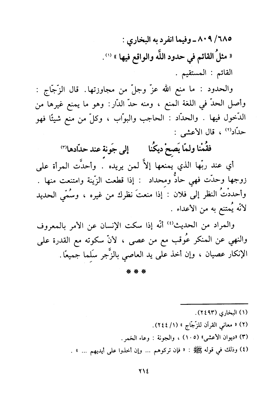 685 - / 809 - وَفِيمَا انْفَرد بِهِ البُخَارِيّ: " مثل الْقَائِم فِي حُدُود الله وَالْوَاقِع فِيهَا ". الْقَائِم: الْمُسْتَقيم. [15] وَالْحُدُود: مَا منع الله عز وَجل من مجاوزتها. قَالَ الزّجاج: وأصل الْحَد فِي اللُّغَة الْمَنْع، وَمِنْه حد الدَّار: وَهُوَ مَا يمْنَع غَيرهَا من الدُّخُول فِيهَا. والحداد: الْحَاجِب والبواب، وكل من منع شَيْئا فَهُوَ حداد، قَالَ الْأَعْشَى: