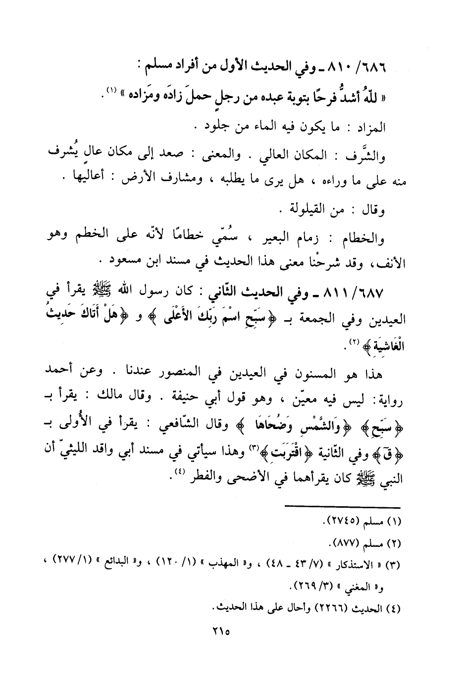 686 - / 810 - وَفِي الحَدِيث الأول من أَفْرَاد مُسلم: " لله أَشد فَرحا بتوبة عَبده من رجل حمل زَاده ومزاده ". [15] المزاد: مَا يكون فِيهِ المَاء من جُلُود. [15] والشرف: الْمَكَان العالي. وَالْمعْنَى: صعد إِلَى مَكَان عَال يشرف مِنْهُ على مَا وَرَاءه، هَل يرى مَا يَطْلُبهُ، ومشارف الأَرْض: أعاليها. [15] وَقَالَ: من القيلولة. [15] والخطام: زِمَام الْبَعِير، سمي خطاما لِأَنَّهُ على الخطم وَهُوَ الْأنف، وَقد شرحنا معنى هَذَا الحَدِيث فِي مُسْند ابْن مَسْعُود.