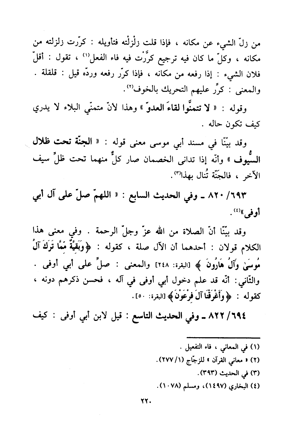 69 - 3 / 820 - وَفِي الحَدِيث السَّابِع: " اللَّهُمَّ صل على آل أبي أوفى ". [15] وَقد بَينا أَن الصَّلَاة من الله عز وَجل الرَّحْمَة. وَفِي معنى هَذَا الْكَلَام قَولَانِ: أَحدهمَا أَن الْآل صلَة، كَقَوْلِه: {وَبَقِيَّة مِمَّا ترك آل مُوسَى وَآل هَارُون} [الْبَقَرَة: 248] وَالْمعْنَى: صل على أبي أوفى. [15] وَالثَّانِي: أَنه قد علم دُخُول أبي أوفى فِي آله، فَحسن ذكرهم دونه، كَقَوْلِه: {وأغرقنا آل فِرْعَوْن} [الْبَقَرَة: 50] .