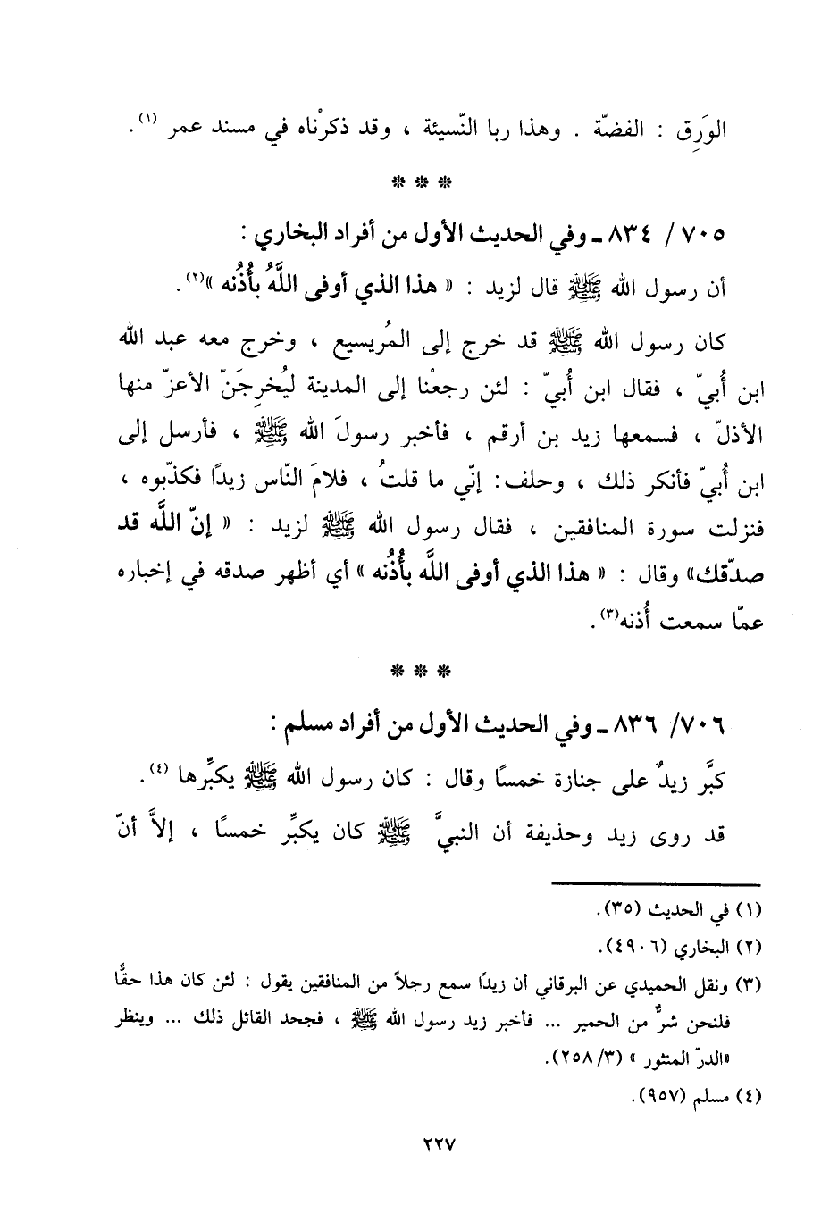 706 - / 836 وَفِي الحَدِيث الأول من أَفْرَاد مُسلم: [15] كبر زيد على جَنَازَة خمْسا وَقَالَ: كَانَ رَسُول الله صلى الله عَلَيْهِ وَسلم يكبرها. [15] قد روى زيد وَحُذَيْفَة أَن النَّبِي صلى الله عَلَيْهِ وَسلم كَانَ يكبر خمْسا، إِلَّا أَن