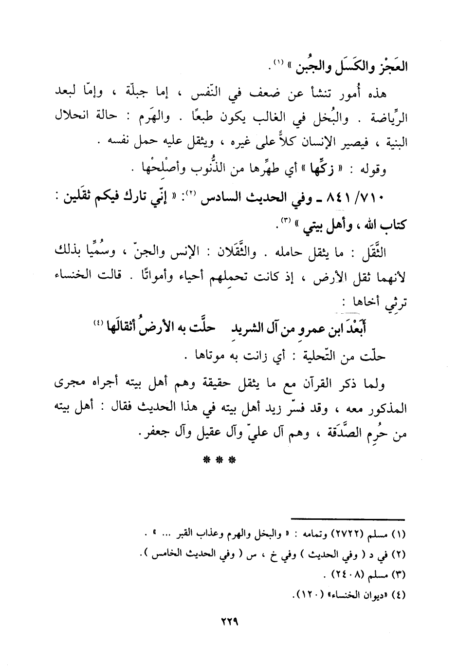 710 - / 841 وَفِي الحَدِيث السَّادِس: " إِنِّي تَارِك فِيكُم ثقلين: كتاب الله، وَأهل بَيْتِي ". [15] الثّقل: مَا يثقل حامله. والثقلان: الْإِنْس وَالْجِنّ، وسميا بذلك لِأَنَّهُمَا ثقل الأَرْض، إِذْ كَانَت تحملهم أَحيَاء وأمواتا. قَالَت الخنساء ترثي أخاها: