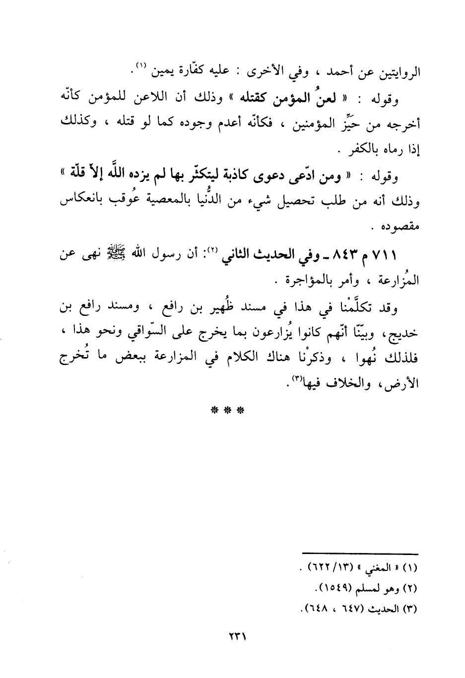 711 - م 843 - وَفِي الحَدِيث الثَّانِي: أَن رَسُول الله صلى الله عَلَيْهِ وَسلم نهى عَن الْمُزَارعَة، وَأمر بالمؤاجرة. [15] وَقد تكلمنا فِي هَذَا فِي مُسْند ظهير بن رَافع، ومسند رَافع بن خديج وَبينا أَنهم كَانُوا يزارعون بِمَا يخرج على السواقي وَنَحْو هَذَا، فَلذَلِك نهوا، وَذكرنَا هُنَاكَ الْكَلَام فِي الْمُزَارعَة بِبَعْض مَا تخرج الأَرْض، وَالْخلاف فِيهَا