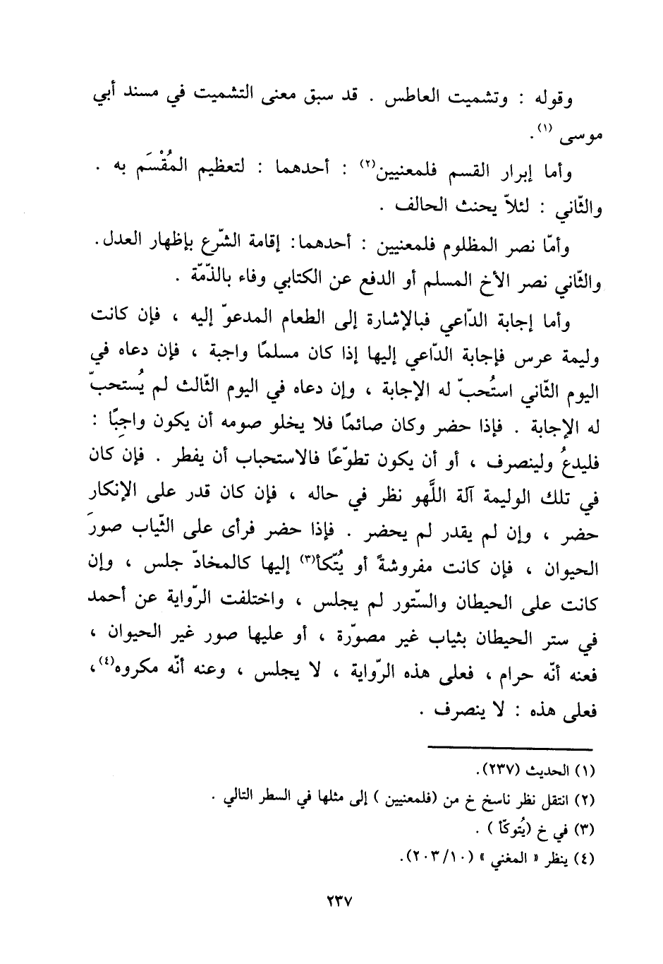 وَقَوله: وتشميت الْعَاطِس. قد سبق معنى التشميت فِي مُسْند أبي مُوسَى. وَأما إبرار الْقسم فلمعنيين: أَحدهمَا: لتعظيم الْمقسم بِهِ. وَالثَّانِي: لِئَلَّا يَحْنَث الْحَالِف. [15] وَأما نصر الْمَظْلُوم فلمعنيين: أَحدهمَا: إِقَامَة الشَّرْع بِإِظْهَار الْعدْل. وَالثَّانِي نصر الْأَخ الْمُسلم أَو الدّفع عَن الْكِتَابِيّ وَفَاء بِالذِّمةِ. [15] وَأما إِجَابَة الدَّاعِي فبالإشارة إِلَى الطَّعَام الْمَدْعُو إِلَيْهِ، فَإِن كَانَت وَلِيمَة عرس فإجابة الدَّاعِي إِلَيْهَا إِذا كَانَ مُسلما وَاجِبَة، فَإِن دَعَاهُ فِي الْيَوْم الثَّانِي اسْتحبَّ لَهُ الْإِجَابَة، وَإِن دَعَاهُ فِي الْيَوْم الثَّالِث لم يسْتَحبّ لَهُ الْإِجَابَة. فَإِذا حضر وَكَانَ صَائِما فَلَا يَخْلُو صَوْمه أَن يكون وَاجِبا: فَليدع ولينصرف، أَو أَن يكون تَطَوّعا فالاستحباب أَن يفْطر. فَإِن كَانَ فِي تِلْكَ الْوَلِيمَة آلَة اللَّهْو نظر فِي حَاله، فَإِن كَانَ قدر على الْإِنْكَار حضر، وَإِن لم يقدر لم يحضر. فَإِذا حضر فَرَأى على الثِّيَاب صور الْحَيَوَان، فَإِن كَانَت مفروشة أَو يتكأ إِلَيْهَا كالمخاد جلس، وَإِن كَانَت على الْحِيطَان والستور لم يجلس، وَاخْتلفت الرِّوَايَة عَن أَحْمد فِي ستر الْحِيطَان بِثِيَاب غير مصورة، أَو عَلَيْهَا صور غير الْحَيَوَان، فَعَنْهُ أَنه حرَام، فعلى هَذِه الرِّوَايَة، لَا يجلس، وَعنهُ أَنه مَكْرُوه، فعلى هَذِه: لَا ينْصَرف.