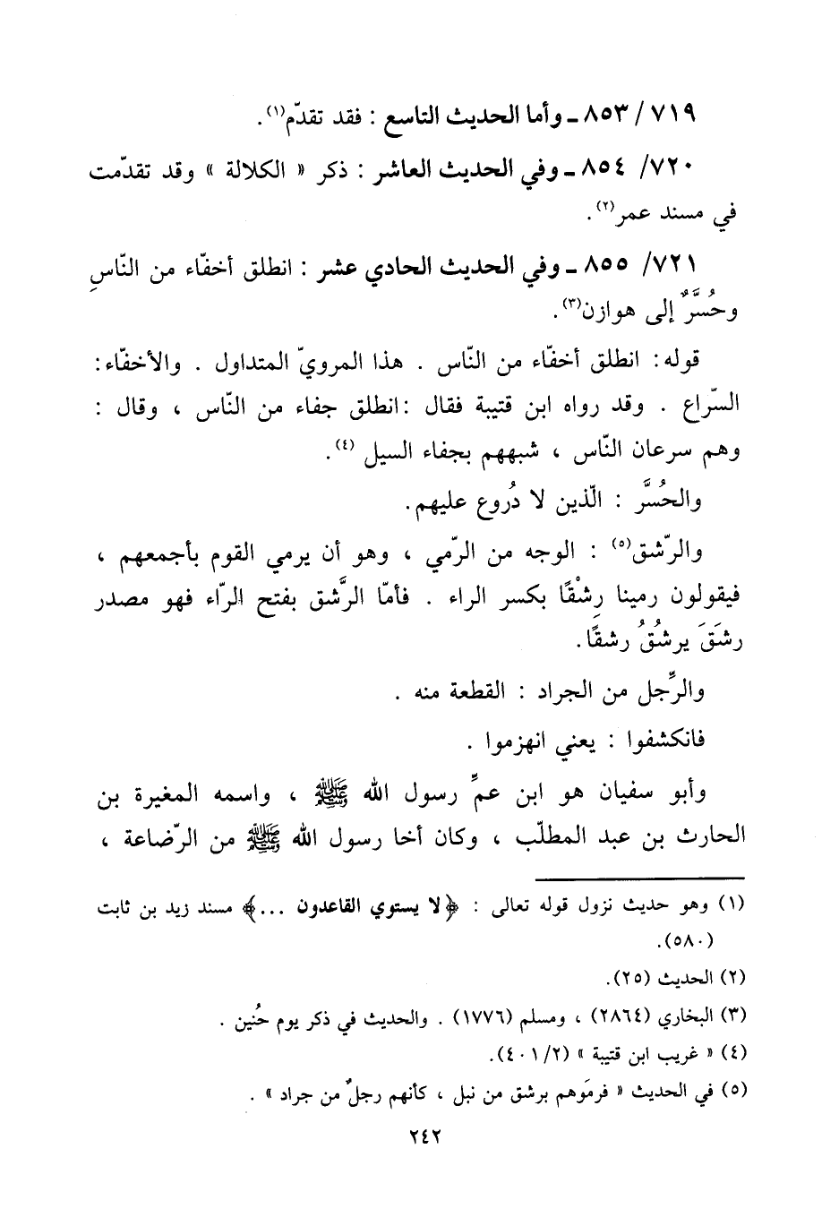 721 - / 855 - وَفِي الحَدِيث الْحَادِي عشر: انْطلق أخفاء من النَّاس وحسر إِلَى هوَازن. [15] قَوْله: انْطلق أخفاء من النَّاس. هَذَا الْمَرْوِيّ المتداول. والأخفاء: السراع. وَقد رَوَاهُ ابْن قُتَيْبَة فَقَالَ: انْطلق جفَاء من النَّاس، وَقَالَ: وهم سرعَان النَّاس، شبههم بجفاء السَّيْل. [15] والحسر: الَّذين لَا دروع عَلَيْهِم. والرشق: الْوَجْه من الرَّمْي، وَهُوَ أَن يَرْمِي الْقَوْم بأجمعهم، فَيَقُولُونَ رمينَا رشقا بِكَسْر الرَّاء فَأَما الرشق بِفَتْح الرَّاء فَهُوَ مصدر رشق يرشق رشقا. [15] وَالرجل من الْجَرَاد: الْقطعَة مِنْهُ. [15] فانكشفوا: يَعْنِي انْهَزمُوا. [15] وَأَبُو سُفْيَان هُوَ ابْن عَم رَسُول الله صلى الله عَلَيْهِ وَسلم، واسْمه الْمُغيرَة بن الْحَارِث بن عبد الْمطلب، وَكَانَ أَخا رَسُول الله صلى الله عَلَيْهِ وَسلم من الرضَاعَة،