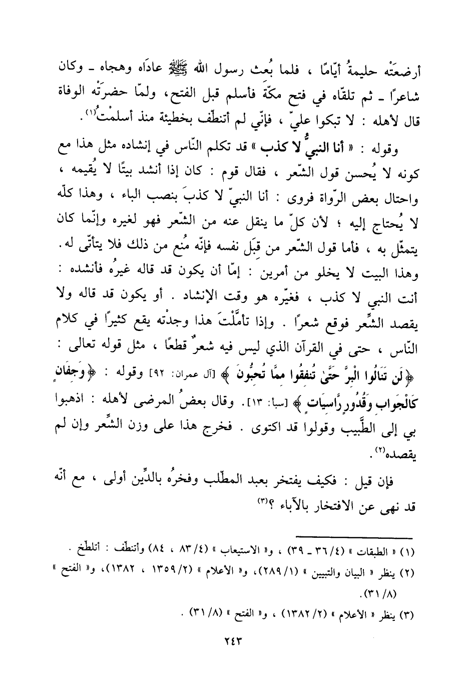 أَرْضَعَتْه حليمة أَيَّامًا، فَلَمَّا بعث رَسُول الله صلى الله عَلَيْهِ وَسلم عَادَاهُ وهجاه وَكَانَ شَاعِرًا ثمَّ تَلقاهُ فِي فتح مَكَّة فَأسلم قبل الْفَتْح، وَلما حَضرته الْوَفَاة قَالَ لأَهله: لَا تبكوا عَليّ، فَإِنِّي لم أتنطف بخطيئة مُنْذُ أسلمت. [15] وَقَوله: " أَنا النَّبِي لَا كذب " قد تكلم النَّاس فِي إنشاده مثل هَذَا مَعَ كَونه لَا يحسن قَول الشّعْر، فَقَالَ قوم: كَانَ إِذا أنْشد بَيْتا لَا يقيمه، واحتال بعض الروَاة فروى: أَنا النَّبِي لَا كذب بِنصب الْبَاء، وَهَذَا كُله لَا يحْتَاج إِلَيْهِ؛ لِأَن كل مَا ينْقل عَنهُ من الشّعْر فَهُوَ لغيره وَإِنَّمَا كَانَ يتَمَثَّل بِهِ، فَأَما قَول الشّعْر من قبل نَفسه فَإِنَّهُ منع من ذَلِك فَلَا يَتَأَتَّى لَهُ. وَهَذَا الْبَيْت لَا يَخْلُو من أَمريْن: إِمَّا أَن يكون قد قَالَه غَيره فأنشده: أَنْت النَّبِي لَا كذب، فَغَيره هُوَ وَقت الإنشاد. أَو يكون قد قَالَه وَلَا يقْصد الشّعْر فَوَقع شعرًا. وَإِذا تَأَمَّلت هَذَا وجدته يَقع كثيرا فِي كَلَام النَّاس، حَتَّى فِي الْقُرْآن الَّذِي لَيْسَ فِيهِ شعر قطعا، مثل قَوْله تَعَالَى: {لن تنالوا الْبر حَتَّى تنفقوا مِمَّا تحبون} [آل عمرَان: 92] وَقَوله: {وجفان كالجواب وقدور راسيات} [سبأ: 13] . وَقَالَ بعض المرضى لأَهله: اذْهَبُوا بِي إِلَى الطَّبِيب وَقُولُوا قد اكتوى. فَخرج هَذَا على وزن الشّعْر وَإِن لم يَقْصِدهُ. [15] فَإِن قيل: فَكيف يفتخر بِعَبْد الْمطلب وفخره بِالدّينِ أولى، مَعَ أَنه قد نهى عَن الافتخار بِالْآبَاءِ؟