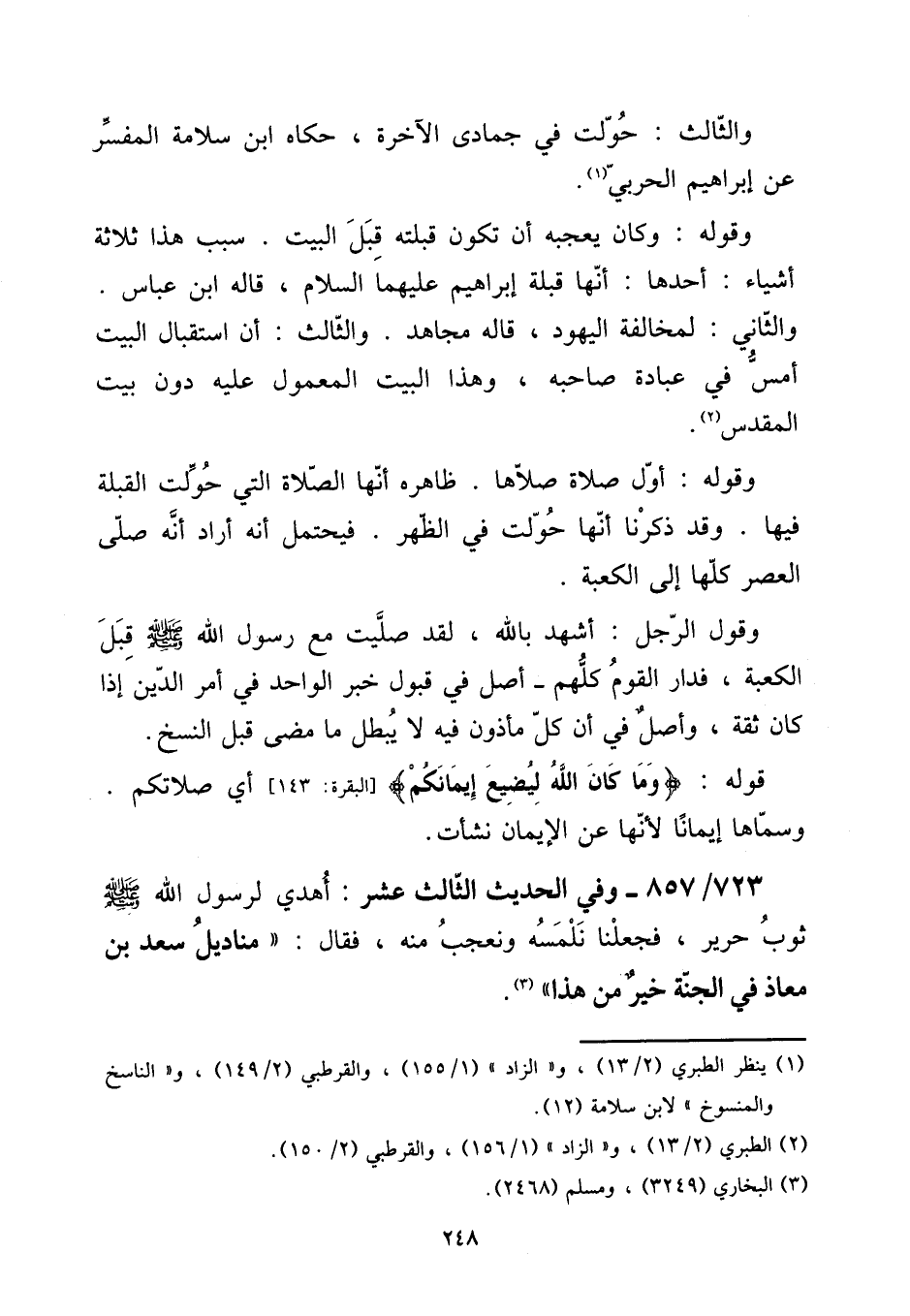 [15] وَالثَّالِث: حولت فِي جُمَادَى الْآخِرَة، حَكَاهُ ابْن سَلامَة الْمُفَسّر عَن إِبْرَاهِيم الْحَرْبِيّ. [15] وَقَوله: وَكَانَ يُعجبهُ أَن تكون قبلته قبل الْبَيْت. سَبَب هَذَا ثَلَاثَة أَشْيَاء: أَحدهَا: أَنَّهَا قبْلَة إِبْرَاهِيم عَلَيْهِمَا السَّلَام، قَالَه ابْن عَبَّاس. وَالثَّانِي: لمُخَالفَة الْيَهُود، قَالَه مُجَاهِد. وَالثَّالِث: أَن اسْتِقْبَال الْبَيْت أمس فِي عبَادَة صَاحبه، وَهَذَا الْبَيْت الْمَعْمُول عَلَيْهِ دون بَيت الْمُقَدّس. [15] وَقَوله: أول صَلَاة صلاهَا. ظَاهره أَنَّهَا الصَّلَاة الَّتِي حولت الْقبْلَة فِيهَا. وَقد ذكرنَا أَنَّهَا حولت فِي الظّهْر. فَيحْتَمل أَنه أَرَادَ أَنه صلى الْعَصْر كلهَا إِلَى الْكَعْبَة. [15] وَقَول الرجل: أشهد بِاللَّه، لقد صليت مَعَ رَسُول الله صلى الله عَلَيْهِ وَسلم قبل الْكَعْبَة، فدار الْقَوْم كلهم - أصل فِي قبُول خبر الْوَاحِد فِي أَمر الدّين إِذا كَانَ ثِقَة، وأصل فِي أَن كل مَأْذُون فِيهِ لَا يبطل مَا مضى قبل النّسخ. [15] قَوْله: {وَمَا كَانَ الله لِيُضيع إيمَانكُمْ} [الْبَقَرَة: 143] أَي صَلَاتكُمْ. وسماها إِيمَانًا لِأَنَّهَا عَن الْإِيمَان نشأت.