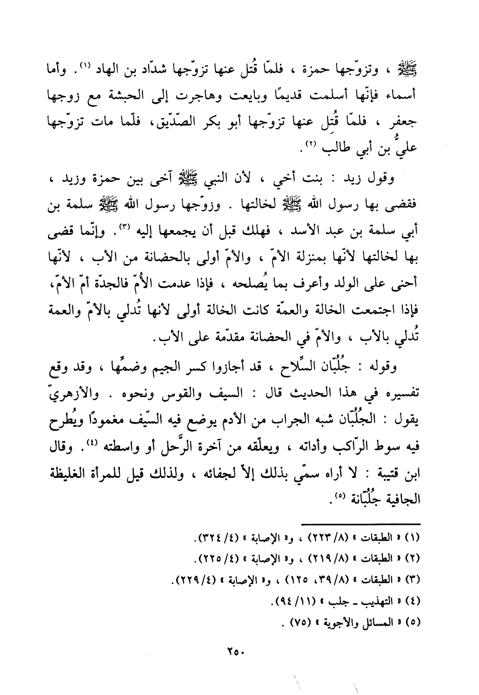 صلى الله عَلَيْهِ وَسلم، وَتَزَوجهَا حَمْزَة، فَلَمَّا قتل عَنْهَا تزَوجهَا شَدَّاد بن الْهَاد. وَأما أَسمَاء فَإِنَّهَا أسلمت قَدِيما وبايعت وَهَاجَرت إِلَى الْحَبَشَة مَعَ زَوجهَا جَعْفَر، فَلَمَّا قتل عَنْهَا تزَوجهَا أَبُو بكر الصّديق، فَلَمَّا مَاتَ تزَوجهَا عَليّ بن أبي طَالب. [15] وَقَول زيد: بنت أخي، لِأَن النَّبِي صلى الله عَلَيْهِ وَسلم آخى بَين حَمْزَة وَزيد، فَقضى بهَا رَسُول الله صلى الله عَلَيْهِ وَسلم لخالتها. وَزوجهَا رَسُول الله صلى الله عَلَيْهِ وَسلم سَلمَة بن أبي سَلمَة بن عبد الْأسد، فَهَلَك قبل أَن يجمعها إِلَيْهِ. وَإِنَّمَا قضى بهَا لخالتها لِأَنَّهَا بِمَنْزِلَة الْأُم، وَالأُم أولى بالحضانة من الْأَب، لِأَنَّهَا أحنى على الْوَلَد وَأعرف بِمَا يصلحه، فَإِذا عدمت الْأُم فالجدة أم الْأُم، فَإِذا اجْتمعت الْخَالَة والعمة كَانَت الْخَالَة أولى لِأَنَّهَا تدلي بِالْأُمِّ والعمة تدلي بِالْأَبِ، وَالأُم فِي الْحَضَانَة مُقَدّمَة على الْأَب. [15] وَقَوله: جلبان السِّلَاح، قد أَجَازُوا كسر الْجِيم وَضمّهَا، وَقد وَقع تَفْسِيره فِي هَذَا الحَدِيث قَالَ: السَّيْف والقوس وَنَحْوه. والأزهري يَقُول: الجلبان شبه الجراب من الْأدم يوضع فِيهِ السَّيْف مغمودا ويطرح فِيهِ سَوط الرَّاكِب وأداته، ويعلقه من آخِرَة الرحل أَو واسطته. وَقَالَ ابْن قُتَيْبَة: لَا أرَاهُ سمي بذلك إِلَّا لجفائه، وَلذَلِك قيل للْمَرْأَة الغليظة الجافية جلبانه