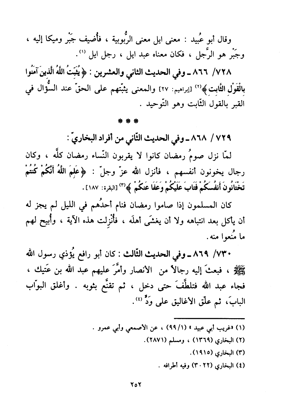 728 - / 866 - وَفِي الحَدِيث الثَّانِي وَالْعِشْرين: {يثبت الله الَّذين آمنُوا بالْقَوْل الثَّابِت} [إِبْرَاهِيم: 27] وَالْمعْنَى يثبتهم على الْحق عِنْد السُّؤَال فِي الْقَبْر بالْقَوْل الثَّابِت وَهُوَ التَّوْحِيد.