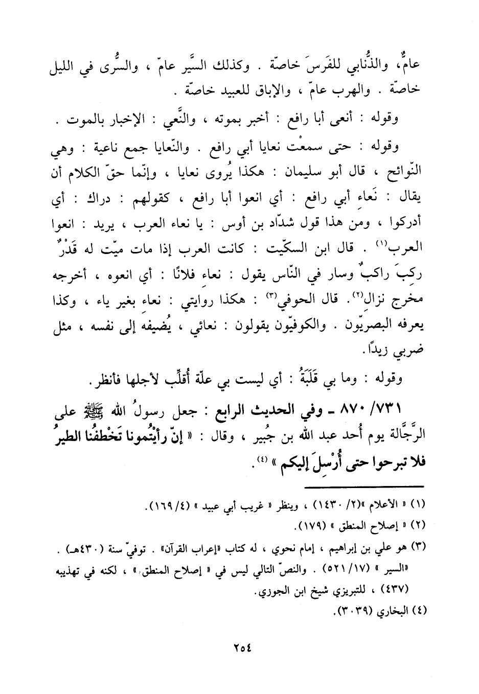731 - / 870 - وَفِي الحَدِيث الرَّابِع: جعل رَسُول الله صلى الله عَلَيْهِ وَسلم على الرجالة يَوْم أحد عبد الله بن جُبَير، وَقَالَ: " إِن رَأَيْتُمُونَا تخطفنا الطير فَلَا تَبْرَحُوا حَتَّى أرسل إِلَيْكُم ".