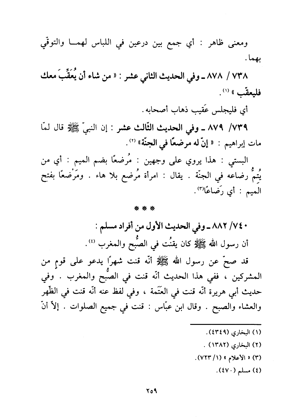740 - / 882 - وَفِي الحَدِيث الأول من أَفْرَاد مُسلم: [15] أَن رَسُول الله صلى الله عَلَيْهِ وَسلم كَانَ يقنت فِي الصُّبْح وَالْمغْرب. [15] قد صَحَّ عَن رَسُول الله صلى الله عَلَيْهِ وَسلم أَنه قنت شهرا يَدْعُو على قوم من الْمُشْركين، فَفِي هَذَا الحَدِيث أَنه قنت فِي الصُّبْح وَالْمغْرب. وَفِي حَدِيث أبي هُرَيْرَة أَنه قنت فِي الْعَتَمَة، وَفِي لفظ عَنهُ أَنه قنت فِي الظّهْر وَالْعشَاء وَالصُّبْح. وَقَالَ ابْن عَبَّاس: قنت فِي جَمِيع الصَّلَوَات. إِلَّا أَن