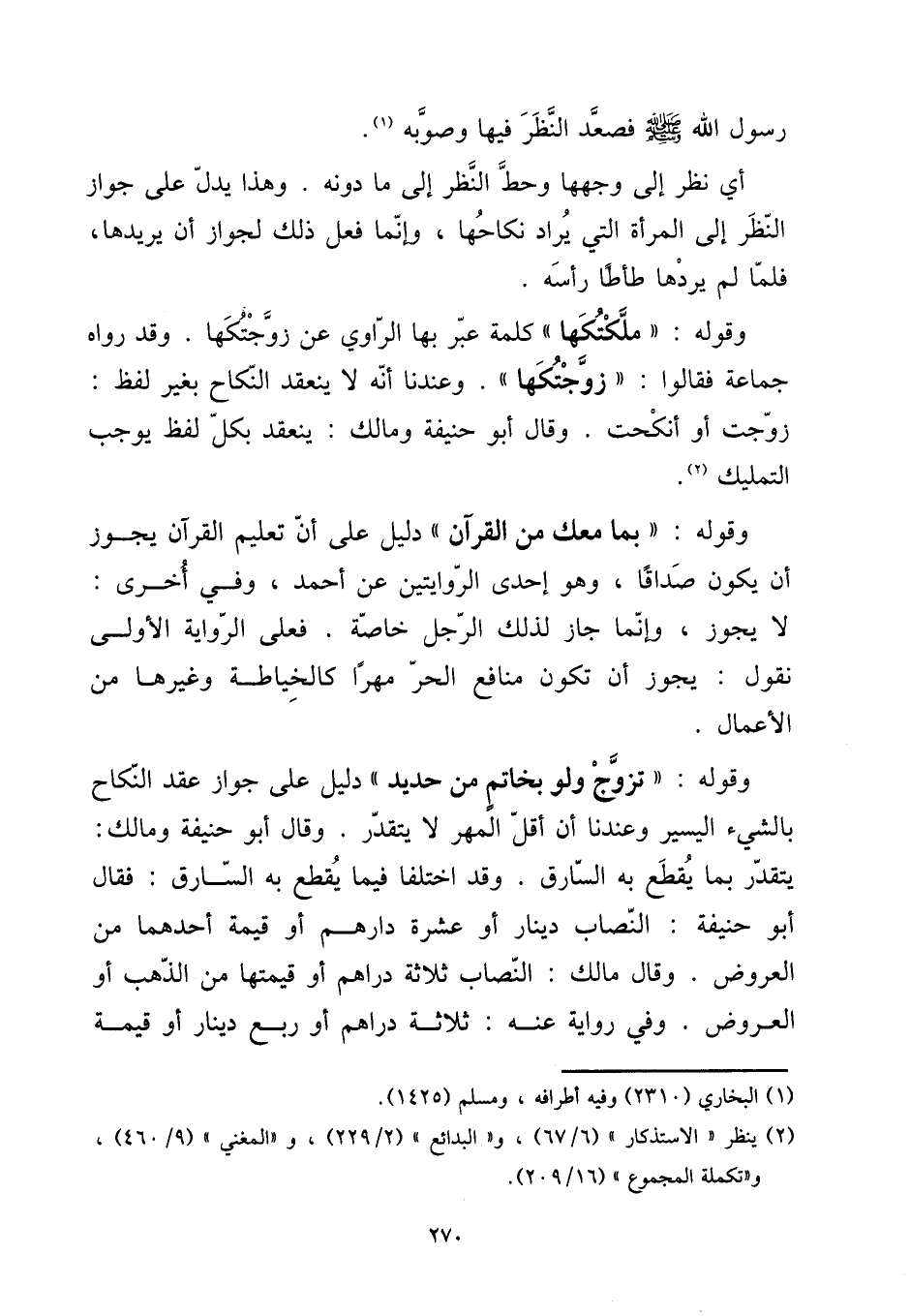 رَسُول الله صلى الله عَلَيْهِ وَسلم فَصَعدَ النّظر فِيهَا وَصَوَّبَهُ. [15] أَي نظر إِلَى وَجههَا وَحط النّظر إِلَى مَا دونه. وَهَذَا يدل على جَوَاز النّظر إِلَى الْمَرْأَة الَّتِي يُرَاد نِكَاحهَا، وَإِنَّمَا فعل ذَلِك لجَوَاز أَن يريدها، فَلَمَّا لم يردهَا طأطأ رَأسه. [15] وَقَوله: " ملكتكها " كلمة عبر بهَا الرَّاوِي عَن زوجتكها. وَقد رَوَاهُ جمَاعَة فَقَالُوا: " زوجتكها ". وَعِنْدنَا أَنه لَا ينْعَقد النِّكَاح بِغَيْر لفظ: زوجت أَو أنكحت. وَقَالَ أَبُو حنيفَة وَمَالك: ينْعَقد بِكُل لفظ يُوجب التَّمْلِيك. [15] وَقَوله: " بِمَا مَعَك من الْقُرْآن " دَلِيل على أَن تَعْلِيم الْقُرْآن يجوز أَن يكون صَدَاقا، وَهُوَ إِحْدَى الرِّوَايَتَيْنِ عَن أَحْمد، وَفِي أُخْرَى: لَا يجوز، وَإِنَّمَا جَازَ لذَلِك الرجل خَاصَّة. فعلى الرِّوَايَة الأولى نقُول: يجوز أَن تكون مَنَافِع الْحر مهْرا كالخياطة وَغَيرهَا من الْأَعْمَال. [15] وَقَوله: " تزوج وَلَو بِخَاتم من حَدِيد " دَلِيل على جَوَاز عقد النِّكَاح بالشَّيْء الْيَسِير وَعِنْدنَا أَن أقل الْمهْر لَا يتَقَدَّر. وَقَالَ أَبُو حنيفَة وَمَالك: يتَقَدَّر بِمَا يقطع بِهِ السَّارِق. وَقد اخْتلفَا فِيمَا يقطع بِهِ السَّارِق: فَقَالَ أَبُو حنيفَة: النّصاب دِينَار أَو عشرَة دَارهم أَو قيمَة أَحدهمَا من الْعرُوض. وَقَالَ مَالك: النّصاب ثَلَاثَة دَرَاهِم أَو قيمتهَا من الذَّهَب أَو الْعرُوض. وَفِي رِوَايَة عَنهُ: ثَلَاثَة دَرَاهِم أَو ربع دِينَار أَو قيمَة