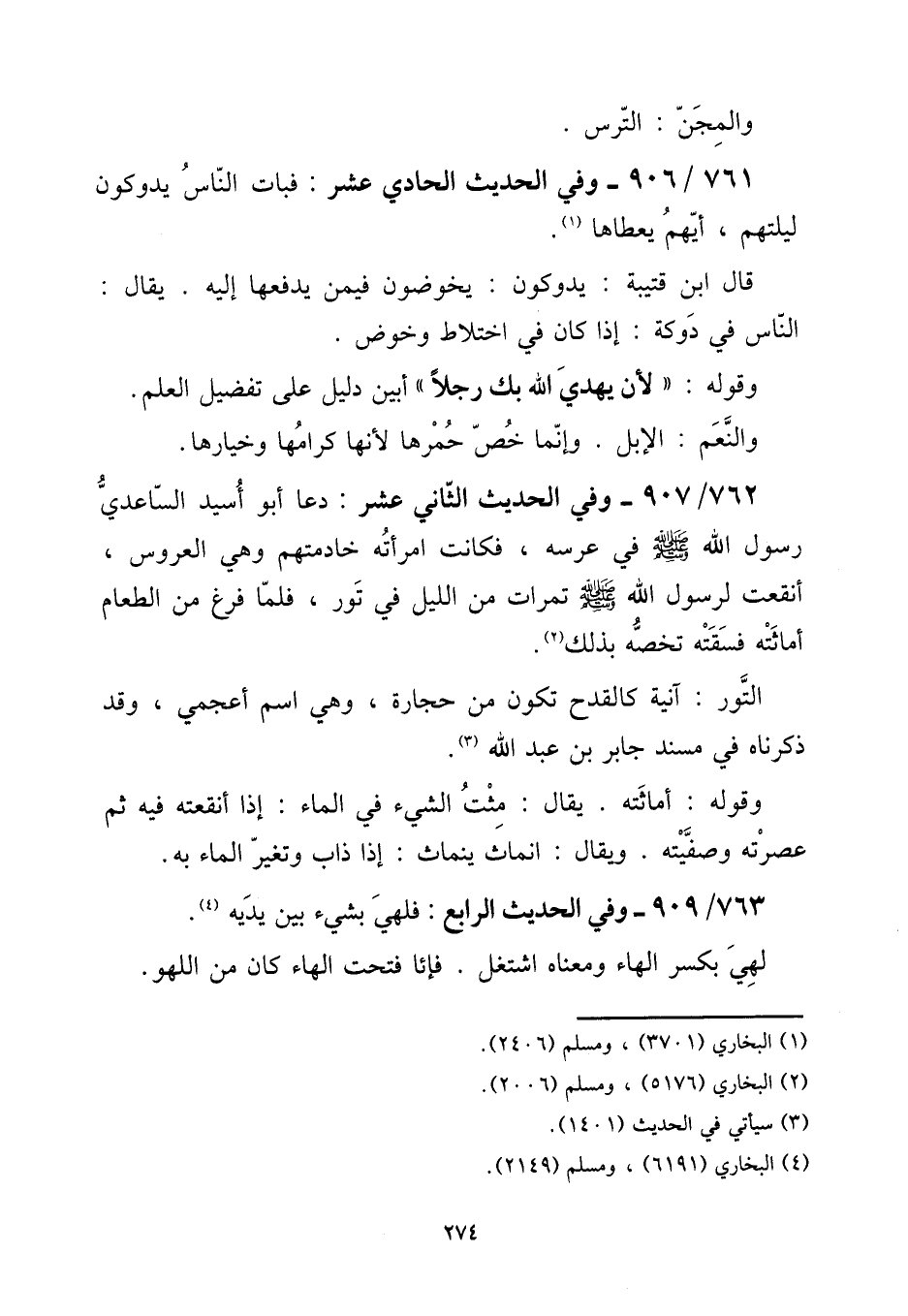 762 - / 907 - وَفِي الحَدِيث الثَّانِي عشر: دَعَا أَبُو أسيد السَّاعِدِيّ رَسُول الله صلى الله عَلَيْهِ وَسلم فِي عرسه، فَكَانَت امْرَأَته خادمتهم وَهِي الْعَرُوس، أنقعت لرَسُول الله صلى الله عَلَيْهِ وَسلم تمرات من اللَّيْل فِي تور، فَلَمَّا فرغ من الطَّعَام أماثته فسقته تخصه بذلك. [15] التور: آنِية كالقدح تكون من حِجَارَة، وَهِي اسْم أعجمي، وَقد ذَكرْنَاهُ فِي مُسْند جَابر بن عبد الله. [15] وَقَوله: أماثته. يُقَال: مثت الشَّيْء فِي المَاء: إِذا أنقعته فِيهِ ثمَّ عصرته وصفيته. وَيُقَال: انماث ينماث: إِذا ذاب وَتغَير المَاء بِهِ.