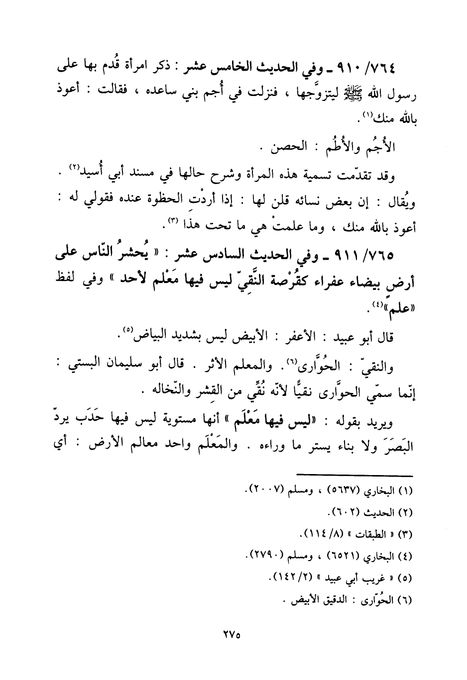 765 - / 911 - وَفِي الحَدِيث السَّادِس عشر: " يحْشر النَّاس على أَرض بَيْضَاء عفراء كقرصة النقي لَيْسَ فِيهَا معلم لأحد " وَفِي لفظ " علم ". [15] قَالَ أَبُو عبيد: العفر: الْأَبْيَض لَيْسَ بشديد الْبيَاض. [15] والنقي: الْحوَاري. والمعلم الْأَثر. قَالَ أَبُو سُلَيْمَان البستي: إِنَّمَا سمي الْحوَاري نقيا لِأَنَّهُ نقي من القشر والنخاله. [15] وَيُرِيد بقوله: " لَيْسَ فِيهِ معلم " أَنَّهَا مستوية لَيْسَ فِيهَا حدب يرد الْبَصَر وَلَا بِنَاء يستر مَا وَرَاءه. والمعلم وَاحِد معالم الأَرْض: أَي