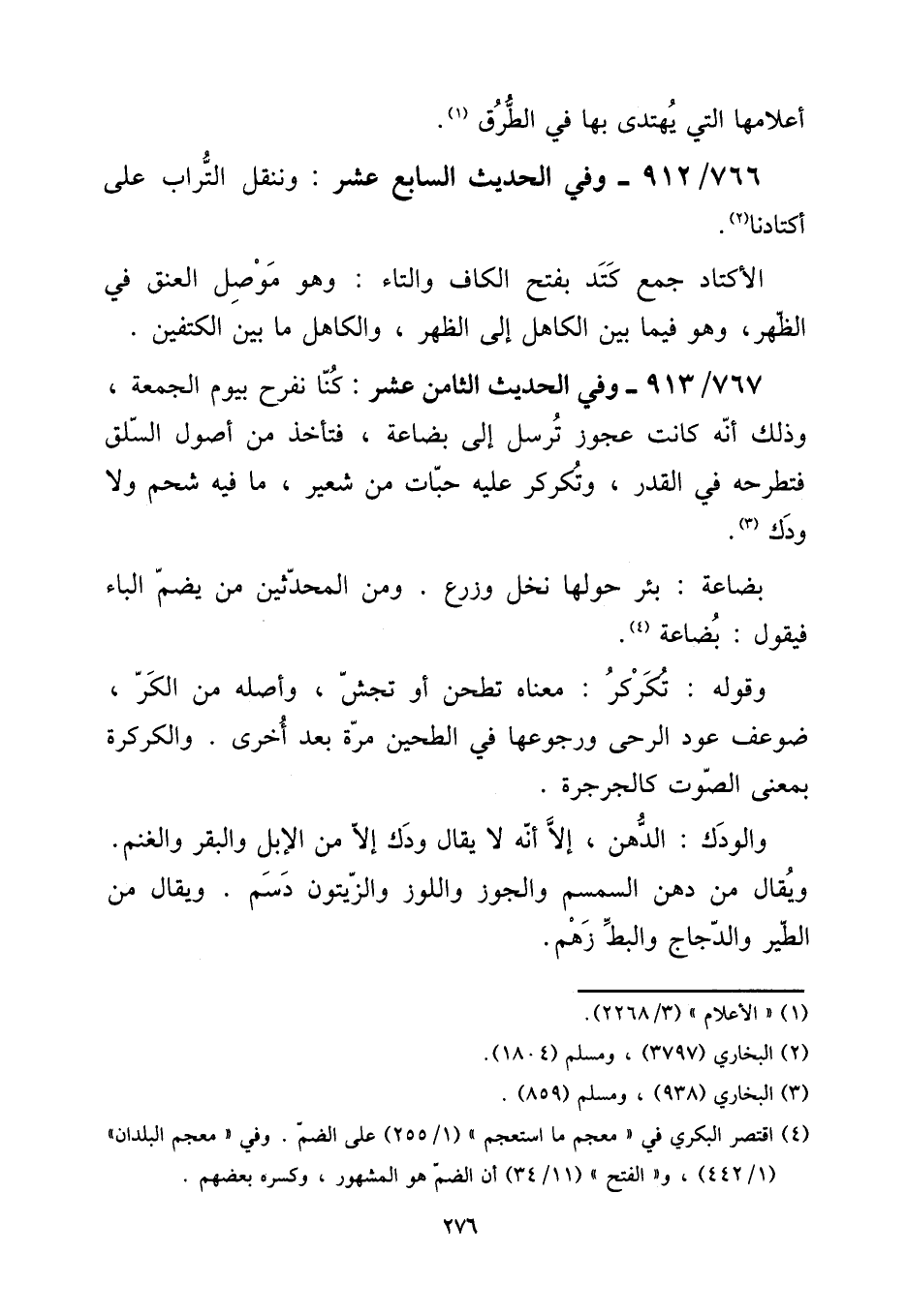 767 - / 913 - وَفِي الحَدِيث الثَّامِن عشر: كُنَّا نفرح بِيَوْم الْجُمُعَة، وَذَلِكَ أَنه كَانَت عَجُوز ترسل إِلَى بضَاعَة، فتأخذ من أصُول السلق فتطرحه فِي الْقدر، وتكركر عَلَيْهِ حبات من شعير، مَا فِيهِ شَحم وَلَا ودك. [15] بضَاعَة: بِئْر حولهَا نخل وَزرع. وَمن الْمُحدثين من يضم الْبَاء فَيَقُول: بضَاعَة. [15] وَقَوله: تكركر: مَعْنَاهُ تطحن أَو تحبش، وَأَصله من الْكر، ضوعف عود الرَّحَى ورجوعها فِي الطحين مرّة بعد أُخْرَى. والكركرة بِمَعْنى الصَّوْت كالجرجرة. [15] والودك: الدّهن، إِلَّا أَنه لَا يُقَال ودك إِلَّا من الْإِبِل وَالْبَقر وَالْغنم. وَيُقَال من دهن السمسم والجوز واللوز وَالزَّيْتُون دسم. وَيُقَال من الطير والدجاج والبط زهم.