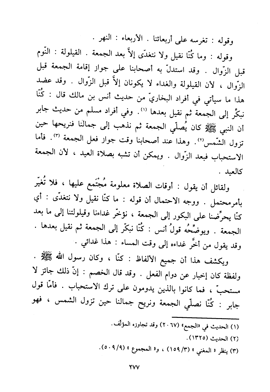 [15] وَقَوله: تغرسه على أربعائنا. الْأَرْبَعَاء: النَّهر. [15] وَقَوله: وَمَا كُنَّا نقِيل وَلَا نتغدى إِلَّا بعد الْجُمُعَة. القيلولة: النّوم قبل الزَّوَال. وَقد اسْتدلَّ بِهِ أَصْحَابنَا على جَوَاز إِقَامَة الْجُمُعَة قبل الزَّوَال، لِأَن القيلولة والغداء لَا يكونَانِ إِلَّا قبل الزَّوَال. وَقد عضد هَذَا مَا سَيَأْتِي فِي أَفْرَاد البُخَارِيّ من حَدِيث أنس بن مَالك قَالَ: كُنَّا نبكر إِلَى الْجُمُعَة ثمَّ نقِيل بعْدهَا. وَفِي أَفْرَاد مُسلم من حَدِيث جَابر أَن النَّبِي صلى الله عَلَيْهِ وَسلم كَانَ يُصَلِّي الْجُمُعَة ثمَّ نَذْهَب إِلَى جمالنا فنريحها حِين تَزُول الشَّمْس. وَهَذَا عِنْد أَصْحَابنَا وَقت جَوَاز فعل الْجُمُعَة. فَأَما الِاسْتِحْبَاب فَبعد الزَّوَال. وَيُمكن أَن تشبه بِصَلَاة الْعِيد، لِأَن الْجُمُعَة كالعيد. [15] وَلقَائِل أَن يَقُول: أَوْقَات الصَّلَاة مَعْلُومَة مُجْتَمع عَلَيْهَا، فَلَا تغير بِأَمْر مُحْتَمل. وَوجه الِاحْتِمَال أَن قَوْله: مَا كُنَّا نقِيل وَلَا نتغدى: أَي كُنَّا يحرضنا على البكور إِلَى الْجُمُعَة، نؤخر غداءنا وقيلولتنا إِلَى مَا بعد الْجُمُعَة. ويوضحه قَول أنس: كُنَّا نبكر إِلَى الْجُمُعَة ثمَّ نقِيل بعْدهَا. وَقد يَقُول من أخر غداءه إِلَى وَقت الْمسَاء: هَذَا غدائي. [15] ويكشف هَذَا أَن جَمِيع الْأَلْفَاظ: كُنَّا، وَكَانَ رَسُول الله صلى الله عَلَيْهِ وَسلم. وَلَفْظَة كَانَ إِخْبَار عَن دوَام الْفِعْل. وَقد قَالَ الْخصم: إِن ذَلِك جَائِز لَا مُسْتَحبّ، فَمَا كَانُوا بالذين يدومون على ترك الِاسْتِحْبَاب. فَأَما قَول جَابر: كُنَّا نصلي الْجُمُعَة ونريح جمالنا حِين تَزُول الشَّمْس، فَهُوَ