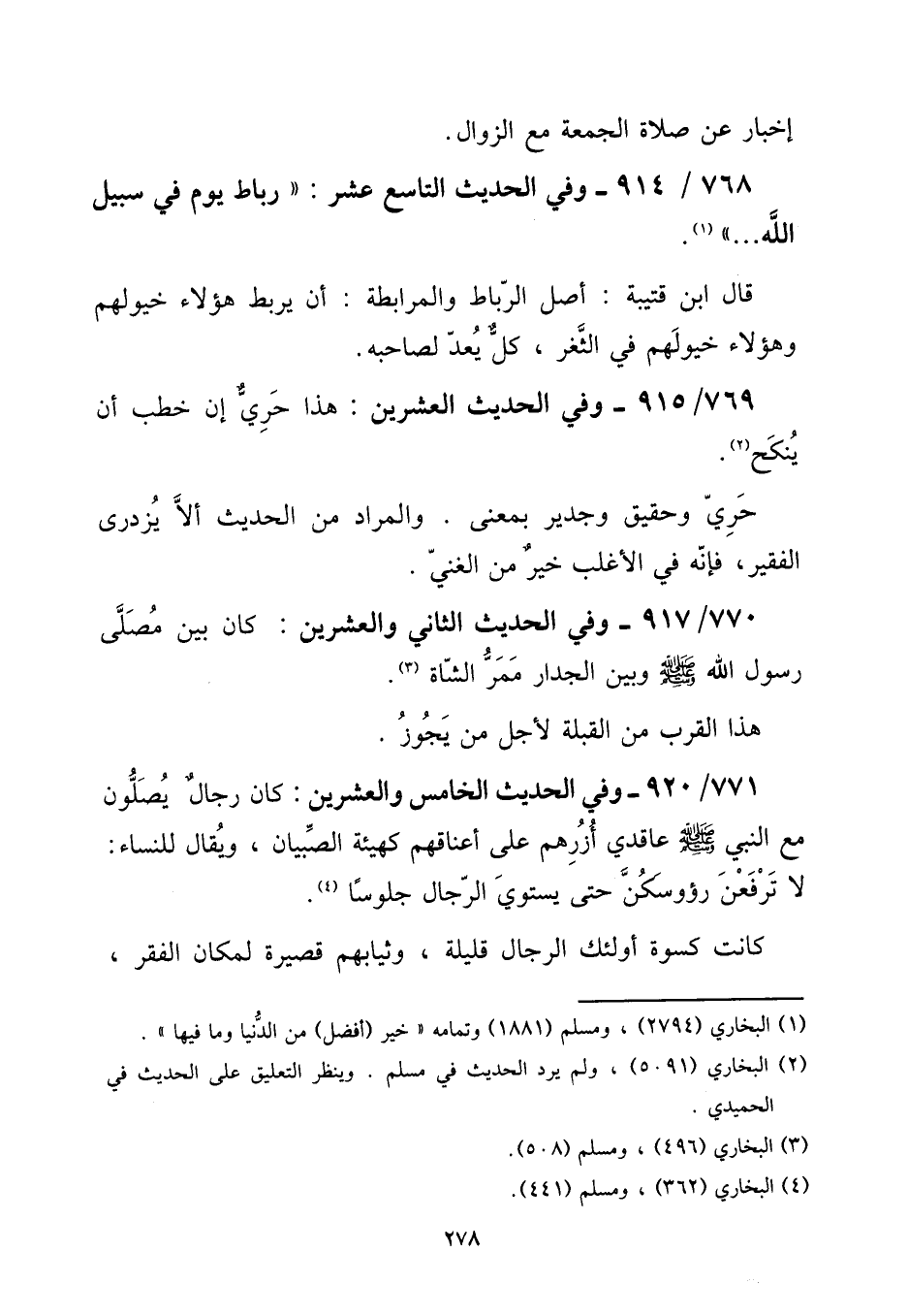 771 - / 920 - وَفِي الحَدِيث الْخَامِس وَالْعِشْرين: كَانَ رجال يصلونَ مَعَ النَّبِي صلى الله عَلَيْهِ وَسلم عاقدي أزرهم على أَعْنَاقهم كَهَيئَةِ الصّبيان، وَيُقَال للنِّسَاء: لَا ترافعن رؤوسكن حَتَّى يَسْتَوِي الرِّجَال جُلُوسًا. [15] كَانَت كسْوَة أُولَئِكَ الرِّجَال قَليلَة، وثيابهم قَصِيرَة لمَكَان الْفقر،