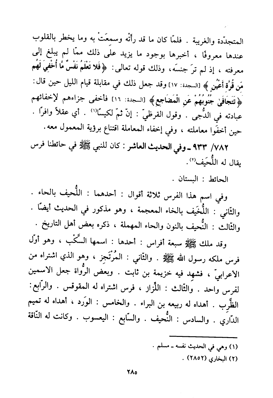 782 - / 933 - وَفِي الحَدِيث الْعَاشِر: كَانَ للنَّبِي صلى الله عَلَيْهِ وَسلم فِي حائطنا فرس يُقَال لَهُ اللحيف. الْحَائِط: الْبُسْتَان. [15] وَفِي اسْم هَذَا الْفرس ثَلَاثَة أَقْوَال: أَحدهمَا: اللحيف بِالْحَاء. وَالثَّانِي: اللخيف بِالْخَاءِ الْمُعْجَمَة، وَهُوَ مَذْكُور فِي الحَدِيث أَيْضا. وَالثَّالِث: النحيف بالنُّون والحاء الْمُهْملَة، ذكره بعض أهل التَّارِيخ. [15] وَقد ملك صلى الله عَلَيْهِ وَسلم سَبْعَة أَفْرَاس: أَحدهمَا: اسْمهَا السكب، وَهُوَ أول فرس ملكه رَسُول الله صلى الله عَلَيْهِ وَسلم. وَالثَّانِي: المرتجز، وَهُوَ الَّذِي اشْتَرَاهُ من الْأَعرَابِي، فَشهد فِيهِ خُزَيْمَة بن ثَابت. وَبَعض الروَاة جعل الاسمين لفرس وَاحِد. وَالثَّالِث: اللزاز، فرس اشْتَرَاهُ لَهُ الْمُقَوْقس. وَالرَّابِع: الظرب. أهداه لَهُ ربيعَة بن الْبَراء. وَالْخَامِس: الْورْد، أهداه لَهُ تَمِيم الدَّارِيّ. وَالسَّادِس النحيف. وَالسَّابِع: اليعسوب. وَكَانَت لَهُ النَّاقة