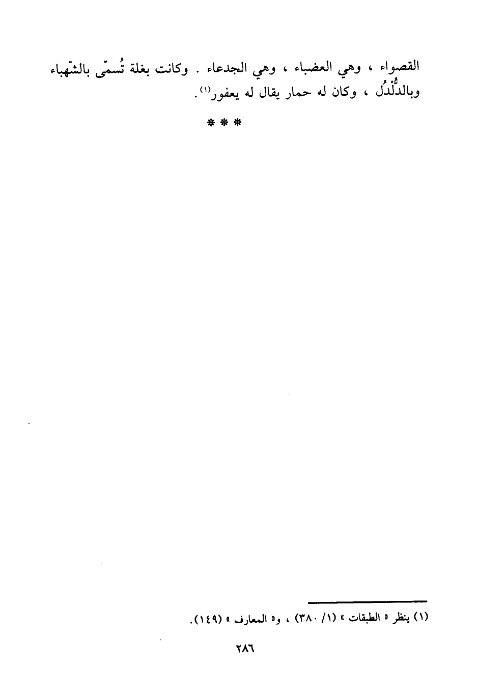 الْقَصْوَاء، وَهِي العضباء، وَهِي الجدعاء. وَكَانَت بغلة تسمى بالشهباء وبالدلدل، وَكَانَ لَهُ حمَار يُقَال لَهُ يَعْفُور.