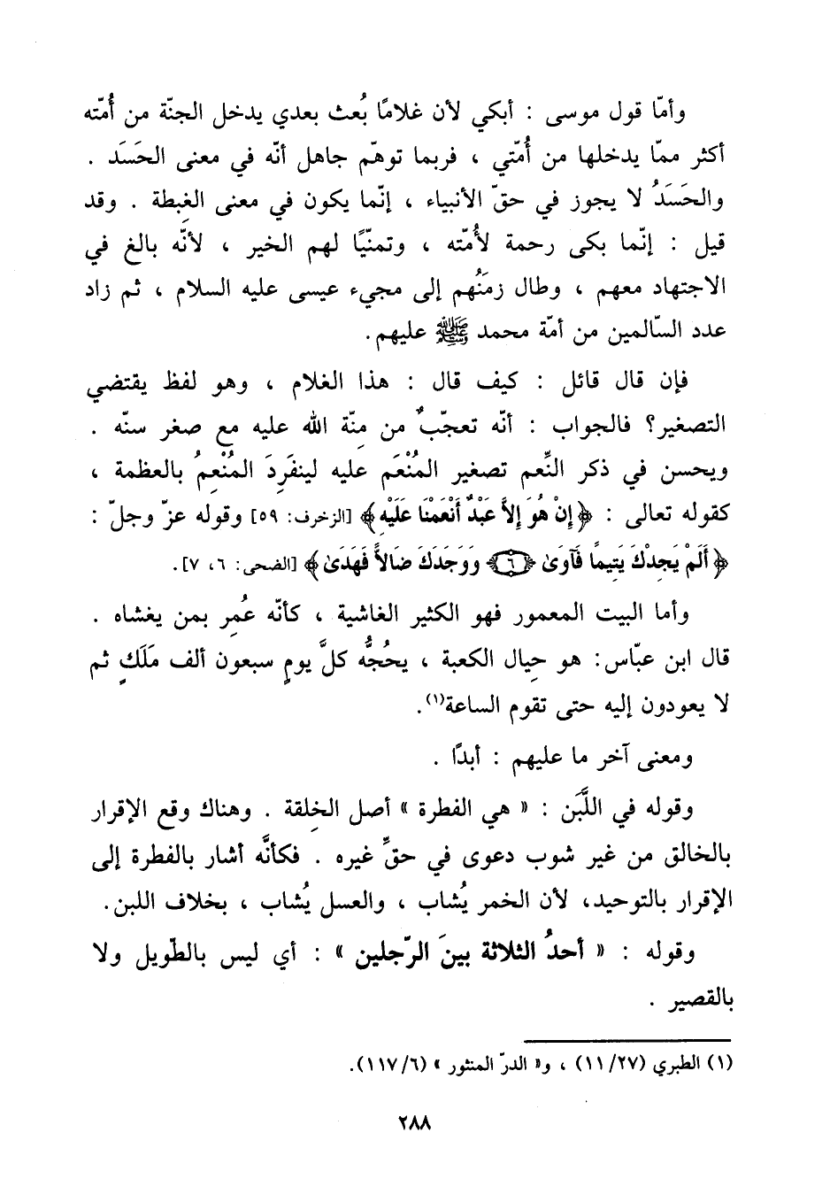 [15] وَأما قَول مُوسَى: أبْكِي لِأَن غُلَاما بعث بعدِي يدْخل الْجنَّة من أمته أَكثر مِمَّا يدخلهَا من أمتِي، فَرُبمَا توهم جَاهِل أَنه فِي معنى الْحَسَد. والحسد لَا يجوز فِي حق الْأَنْبِيَاء، إِنَّمَا يكون فِي معنى الْغِبْطَة. وَقد قيل: إِنَّمَا بَكَى رَحْمَة لأمته، وتمنيا لَهُم الْخَيْر، لِأَنَّهُ بَالغ فِي الِاجْتِهَاد مَعَهم، وَطَالَ زمنهم إِلَى مَجِيء عِيسَى عَلَيْهِ السَّلَام، ثمَّ زَاد عدد السالمين من أمة مُحَمَّد صلى الله عَلَيْهِ وَسلم عَلَيْهِم. [15] فَإِن قَالَ قَائِل: كَيفَ قَالَ: هَذَا الْغُلَام، وَهُوَ لفظ يَقْتَضِي التصغير؟ فَالْجَوَاب: أَنه تعجب من منَّة الله عَلَيْهِ مَعَ صغر سنه. وَيحسن فِي ذكر النعم تَصْغِير الْمُنعم عَلَيْهِ لينفرد الْمُنعم بالعظمة، كَقَوْلِه تَعَالَى: {إِن هُوَ إِلَّا عبد أنعمنا عَلَيْهِ} [الزخرف: 59] وَقَوله عز وَجل: {ألم يجدك يَتِيما فآوى ووجدك ضَالًّا فهدى} [الضُّحَى: 6، 7] . [15] وَأما الْبَيْت الْمَعْمُور فَهُوَ الْكثير الغاشية، كَأَنَّهُ عمر بِمن يَغْشَاهُ. [15] قَالَ ابْن عَبَّاس: هُوَ حِيَال الْكَعْبَة، يحجه كل يَوْم سَبْعُونَ ألف ملك ثمَّ لَا يعودون إِلَيْهِ حَتَّى تقوم السَّاعَة. [15] وَمعنى آخر مَا عَلَيْهِم: أبدا. [15] وَقَوله فِي اللَّبن: " هِيَ الْفطْرَة " أصل الْخلقَة. وَهُنَاكَ وَقع الْإِقْرَار بالخالق من غير شوب دَعْوَى فِي حق غَيره. فَكَأَنَّهُ أَشَارَ بالفطرة إِلَى الْإِقْرَار بِالتَّوْحِيدِ، لِأَن الْخمر يشاب، وَالْعَسَل يشاب، بِخِلَاف اللَّبن. [15] وَقَوله: " أحد الثَّلَاثَة بَين الرجلَيْن ": أَي لَيْسَ بالطويل وَلَا بالقصير.