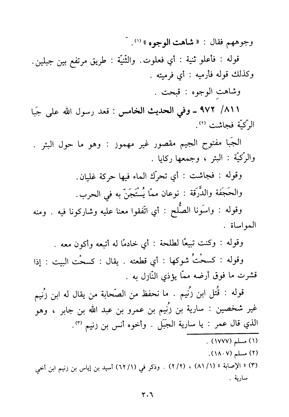811 - / 972 - وَفِي الحَدِيث الْخَامِس: قعد رَسُول الله على جبا الرَّكية فَجَاشَتْ. [15] الجبا مَفْتُوح الْجِيم مَقْصُور غير مَهْمُوز: وَهُوَ مَا حول الْبِئْر. والركية: الْبِئْر، وَجَمعهَا ركايا. [15] وَقَوله: فَجَاشَتْ: أَي تحرّك المَاء فِيهَا حَرَكَة غليان. [15] والحجفة والدرقة: نَوْعَانِ مِمَّا يستجن بِهِ فِي الْحَرْب. وَقَوله: واسونا اصلح: أَي اتَّفقُوا مَعنا عَلَيْهِ وشاركونا فِيهِ. وَمِنْه الْمُوَاسَاة. [15] وَقَوله: وَكنت تبيعا لطلْحَة: أَي خَادِمًا لَهُ أتبعه وأكون مَعَه. [15] وَقَوله: كسحت شَوْكهَا: أَي قطعته. يُقَال: كسحت الْبَيْت: إِذا قشرت مَا فَوق أرضه مِمَّا يُؤْذِي النَّازِل بِهِ. [15] قَوْله: قتل ابْن زنيم. مَا نَحْفَظ من الصَّحَابَة من يُقَال لَهُ ابْن زنيم غير شَخْصَيْنِ: سَارِيَة بن زنيم بن عَمْرو بن عبد الله بن جَابر، وَهُوَ الَّذِي قَالَ عمر: يَا سَارِيَة الْجَبَل. وَأَخُوهُ أنس بن زنيم.