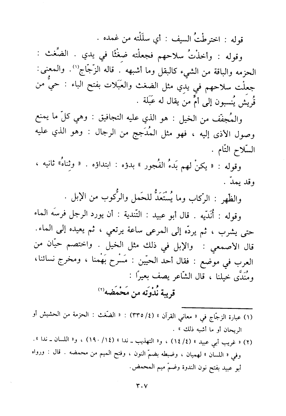 قَوْله: اخترطت السَّيْف: أَي سللته من غمده. [15] وَقَوله: وَأخذت سِلَاحهمْ فَجَعَلته ضغثا فِي يَدي. الضغث: الحزمة والباقة من الشَّيْء كالبقل وَمَا أشبهه. قَالَه الزّجاج. وَالْمعْنَى جعلت سِلَاحهمْ فِي يَدي مثل الضغث والعبلات بِفَتْح الْبَاء: حَيّ من قُرَيْش ينسبون إِلَى أم من يُقَال لَهُ عبلة. [15] والمجفف من الْخَيل: هُوَ الَّذِي عَلَيْهِ التجافيق: وَهِي كل مَا يمْنَع وُصُول الْأَذَى إِلَيْهِ، فَهُوَ مثل المدجج من الرِّجَال: وَهُوَ الَّذِي عَلَيْهِ السِّلَاح التَّام. [15] وَقَوله: " يكن لَهُم بَدْء الْفُجُور " بدؤه: ابتداؤه. " وثناه " ثَانِيه، وَقد يمد. [15] وَالظّهْر: الركاب وَمَا يستعد للْحَمْل وَالرُّكُوب من الْإِبِل. [15] وَقَوله: أنديه. قَالَ أَبُو عبيد: التندية: أَن يُورد الرجل فرسه المَاء حَتَّى يشرب، ثمَّ يردهُ إِلَى المرعى سَاعَة يرتعي، ثمَّ يُعِيدهُ إِلَى المَاء. قَالَ الْأَصْمَعِي: وَالْإِبِل فِي ذَلِك مثل الْخَيل. واختصم حَيَّان من الْعَرَب فِي مَوضِع: فَقَالَ أحد الْحَيَّيْنِ: مسرح بهمنا، ومخرج نسائنا، ومندى خَيْلنَا، قَالَ الشَّاعِر يصف بَعِيرًا: