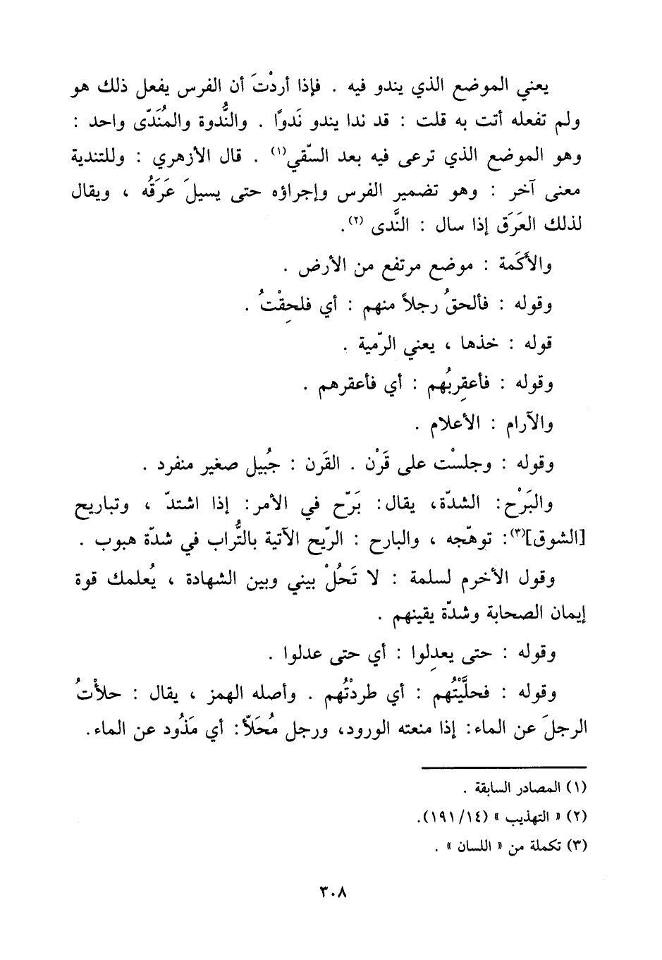 [15] يَعْنِي الْموضع الَّذِي يندو فِيهِ. فَإِذا أردْت أَن الْفرس يفعل ذَلِك هُوَ وَلم تَفْعَلهُ أَتَت بِهِ قلت: قد ندا يندو ندوا. والندوة والمندى وَاحِد: وَهُوَ الْموضع الَّذِي ترعى فِيهِ بعد السَّقْي. قَالَ الْأَزْهَرِي: وللتندية معنى آخر: وَهُوَ تضمير الْفرس وإجراؤه حَتَّى يسيل عرقه، وَيُقَال لذَلِك الْعرق إِذا سَالَ: الندى. [15] والأكمة: مَوضِع مُرْتَفع من الأَرْض. [15] وَقَوله: فَألْحق رجلا مِنْهُم: أَي فلحقت. [15] قَوْله: خُذْهَا، يَعْنِي الرَّمية، [15] وَقَوله: فأعقربهم: أَي فأعقرهم. [15] والآرم: الْأَعْلَام. [15] وَقَوله: وَجَلَست على قرن. الْقرن: جبيل صَغِير مُنْفَرد. [15] والبرح: الشدَّة، يُقَال: برح فِي الْأَمر: إِذا اشْتَدَّ، وتباريح [الشوق] : توهجه، والبارح: الرّيح الْآتِيَة بِالتُّرَابِ فِي شدَّة هبوب. [15] وَقَول الأخرم لسَلمَة: لَا تحل بيني وَبَين الشَّهَادَة، يعلمك قُوَّة إِيمَان الصَّحَابَة وَشدَّة يقينهم. [15] وَقَوله: حَتَّى يعدلُوا: أَي حَتَّى عدلوا. [15] وَقَوله: فحليتهم: أَي طردتهم. وَأَصله الْهَمْز، يُقَال: حلأت الرجل عَن المَاء: إِذا منعته الْوُرُود، وَرجل محلأ: أَي مذود عَن المَاء