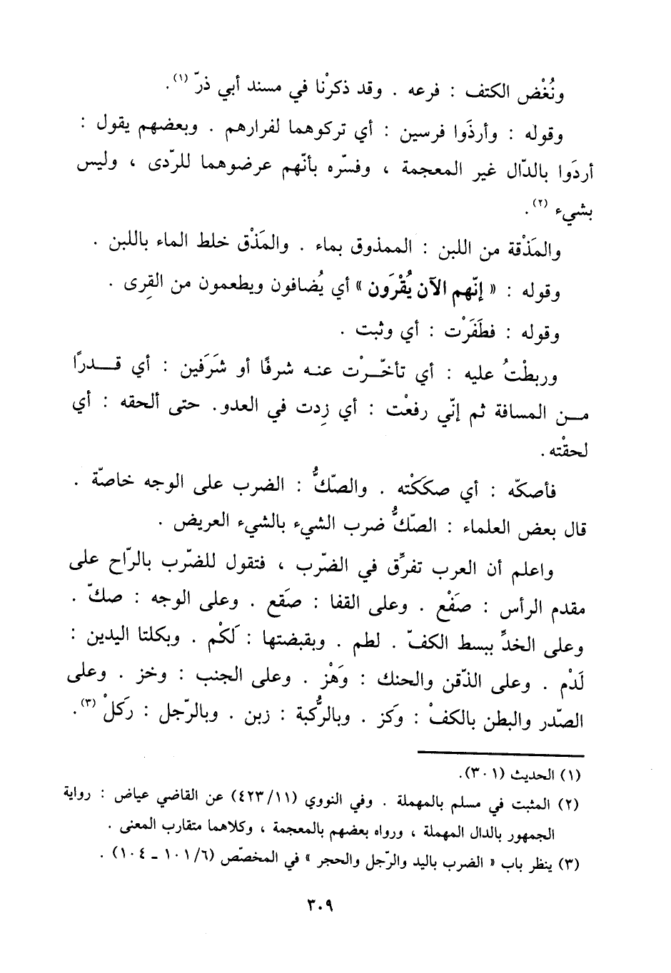 [15] ونغض الْكَتف: فَرعه. وَقد ذكرنَا فِي مُسْند أبي ذَر. [15] وَقَوله: وأرذوا فرسين: أَي تركوهما لفرارهم. وَبَعْضهمْ يَقُول: أردوا بِالدَّال غير الْمُعْجَمَة، وَفَسرهُ بِأَنَّهُم عرضوهما للردى، وَلَيْسَ بِشَيْء. [15] والمذقة: من اللَّبن: الممذوق بِمَاء. والمذق خلط المَاء بِاللَّبنِ. [15] وَقَوله " إِنَّهُم الْآن يقرونَ " أَي يضافون ويطعمون من الْقرى. [15] وَقَوله: فطفرت: أَي وَثَبت. [15] وربطت عَلَيْهِ: أَي تَأَخَّرت عَنهُ شرفا أَو شرفين: أَي قدرا من الْمسَافَة ثمَّ إِنِّي رفعت: أَي زِدْت فِي الْعَدو. حَتَّى ألحقهُ: أَي لحقته. [15] فأصكه: أَي صككته. والصك: الضَّرْب على الْوَجْه خَاصَّة. قَالَ بعض الْعلمَاء: الصَّك ضرب الشَّيْء بالشَّيْء العريض. [15] وَاعْلَم أَن الْعَرَب تفرق فِي الضَّرْب، فَتَقول للضرب بِالرَّاحِ على مقدم الرَّأْس: صفع. وعَلى الْقَفَا: صقع. وعَلى الْوَجْه: صك. وعَلى الخد ببسط الْكَفّ. لطم. وبقبضتها: لكم. وبكلتا الْيَدَيْنِ: لدم. وعَلى الذقن والحنك. وهز. وعَلى الْجنب وخز. وعَلى الصَّدْر والبطن بالكف: وكز. وبالركبة: زبن. وَبِالرجلِ: ركل.