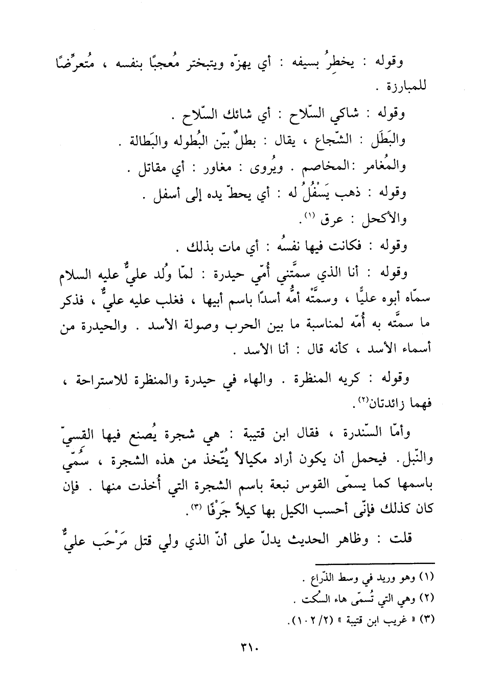 [15] وَقَوله: يخْطر بِسَيْفِهِ: أَي يهزه ويتبختر معجبا بِنَفسِهِ، متعرضا للمبارزة. [15] وَقَوله: شاكي السِّلَاح: أَي شائك السِّلَاح. [15] والبطل: الشجاع، يُقَال: بَطل بَين البطولة والبطالة. [15] والمغامر: المخاصم. ويروى: مغاور: أَي مقَاتل. [15] وَقَوله: ذهب يسفل لَهُ: أَي يحط يَده إِلَى أَسْفَل. [15] والأكحل: عرق. [15] وَقَوله: فَكَانَت فِيهَا نَفسه: أَي مَاتَ بذلك. [15] وَقَوله: أَنا الَّذِي سمتني أُمِّي حيدرة: لما ولد عَليّ عَلَيْهِ السَّلَام سَمَّاهُ أَبوهُ عليا، وسمته أمه أسدا باسم أَبِيهَا، فغلب عَلَيْهِ عَليّ، فَذكر مَا سمته بِهِ أمه لمناسبة مَا بَين الْحَرْب وصولة الْأسد. والحيدرة من أَسمَاء الْأسد، كَأَنَّهُ قَالَ: أَنا الْأسد. [15] وَقَوله: كريه المنظرة. وَالْهَاء فِي حيدرة والمنظرة للاستراحة، فهما زائدتان. [15] وَأما السندرة، فَقَالَ ابْن قُتَيْبَة: هِيَ شَجَرَة يصنع فِيهَا الْقَيْسِي والنبل. فَيحمل أَن يكون أَرَادَ مكيالا يتَّخذ من هَذِه الشَّجَرَة، سمي باسمها كَمَا يُسمى الْقوس نبعة باسم الشَّجَرَة الَّتِي أخذت مِنْهَا. فَإِن كَانَ كَذَلِك فَإِنِّي أَحسب الْكَيْل بهَا كَيْلا جرفا. قلت: وَظَاهر الحَدِيث يدل على أَن الَّذِي ولي قتل مرحب عَليّ