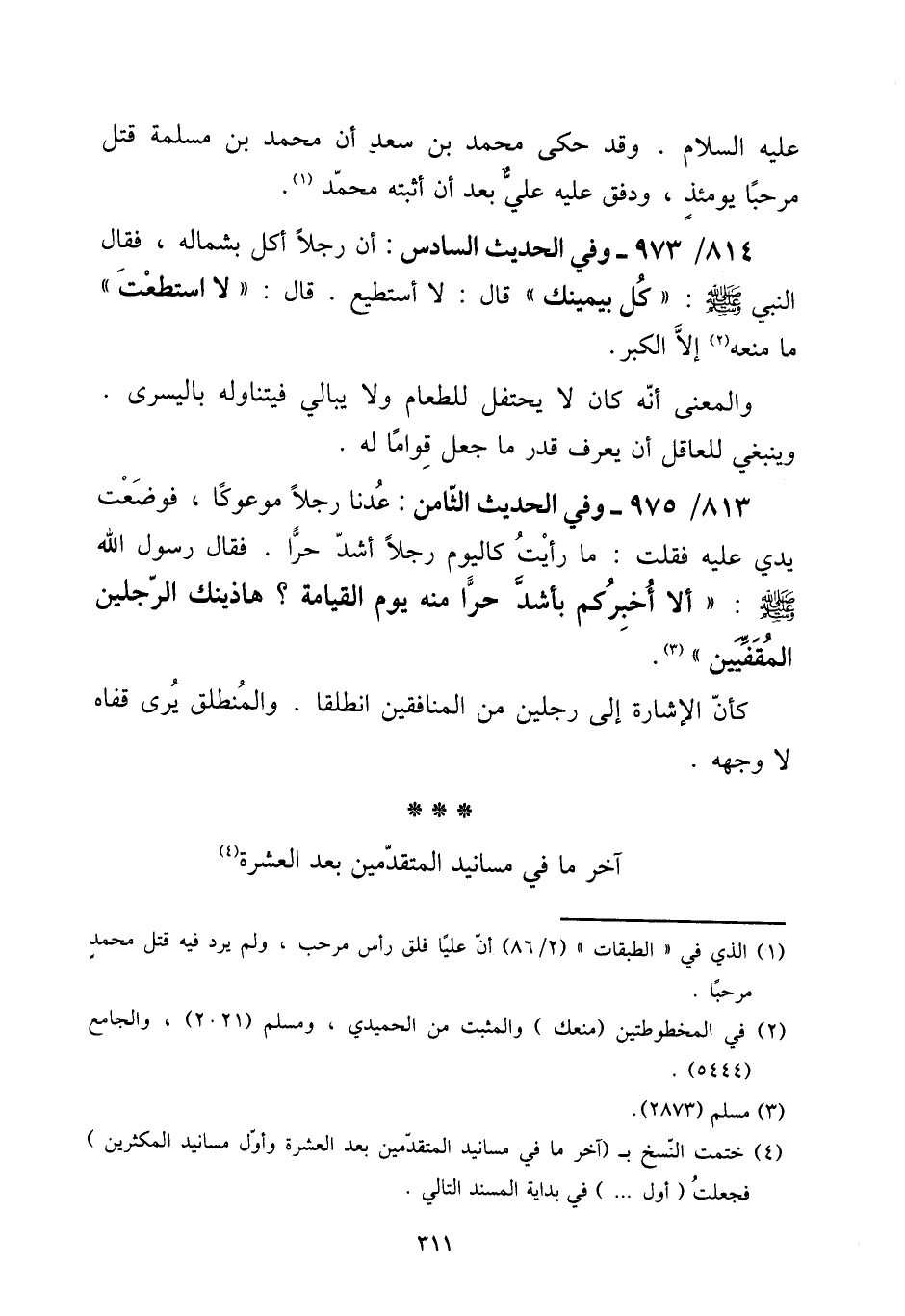 813 - / 975 - وَفِي الحَدِيث الثَّامِن: عدنا رجلا موعوكا، فَوضعت يَدي عَلَيْهِ فَقلت: مَا رَأَيْت كَالْيَوْمِ رجلا أَشد حرا. فَقَالَ رَسُول الله صلى الله عَلَيْهِ وَسلم: " أَلا أخْبركُم بأشد حرا مِنْهُ يَوْم الْقِيَامَة؟ هاذينك الرجلَيْن المقفيين ". [15] كَأَن الْإِشَارَة إِلَى رجلَيْنِ من الْمُنَافِقين انْطَلقَا. والمنطلق يرى قَفاهُ لَا وَجهه. آخر مَا فِي مسانيد الْمُتَقَدِّمين بعد الْعشْرَة